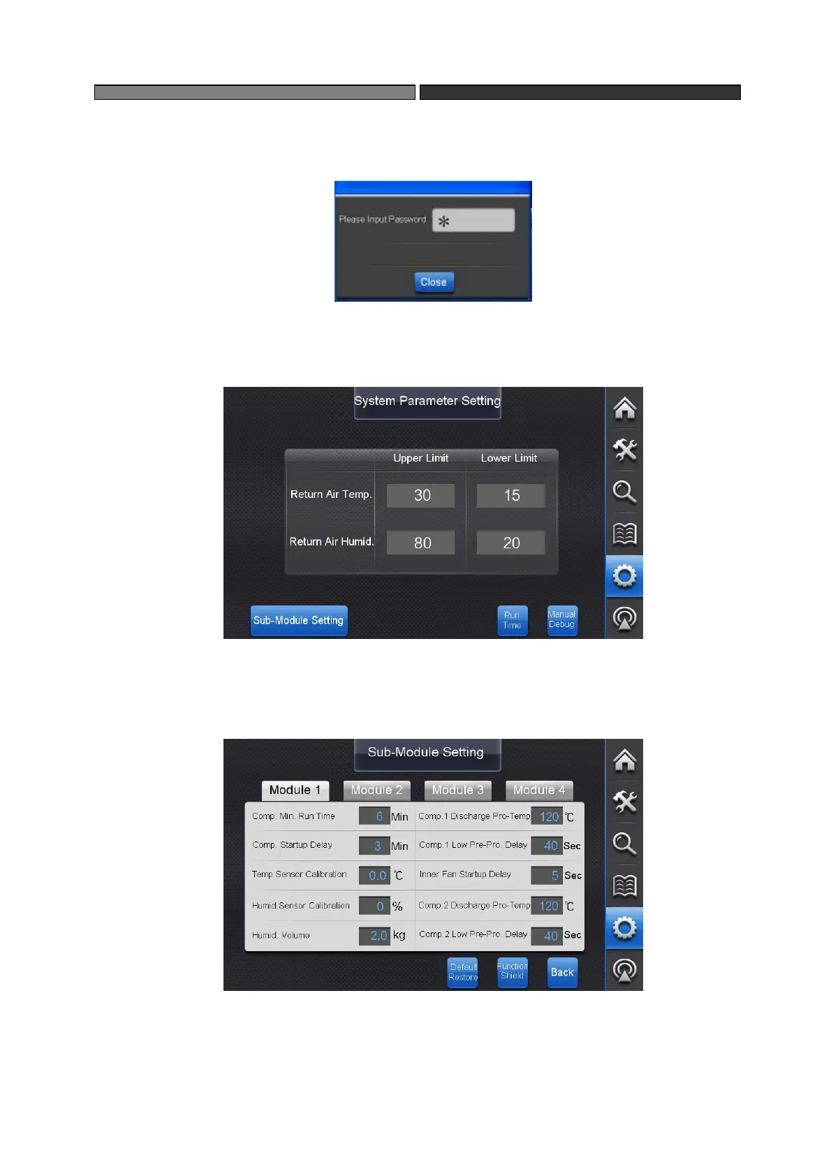 “System Parameter Setting”, “Sub-Module Setting”, “Module Service Time”or “Manual