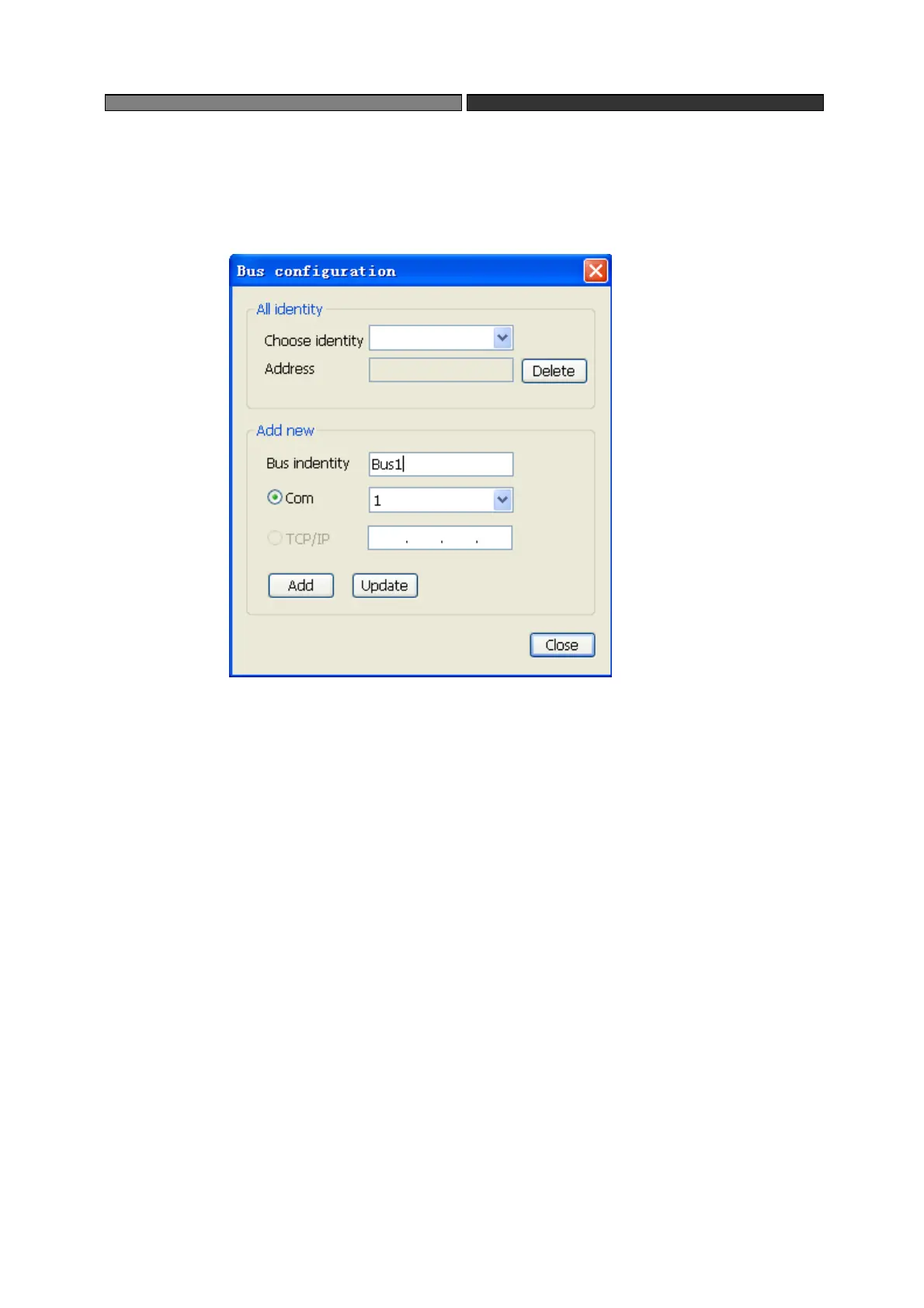 "Bus Identity" , that is decided by yourself and click Add as the following figure. Click "Close" to