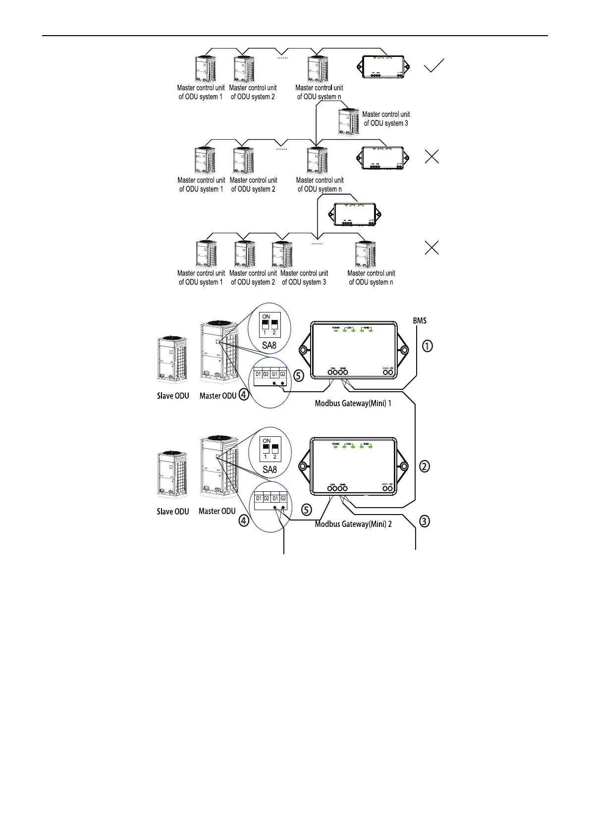 Step 1: Confirm the master ODU that each Modbus Gateway(Mini) shall be connected (set master ODU with SA8 DIP). Please