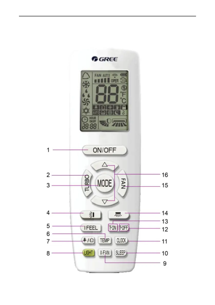 Gree YAP1F - 1 Télécommande YAP1 F; Nom des Touches et Fonctions