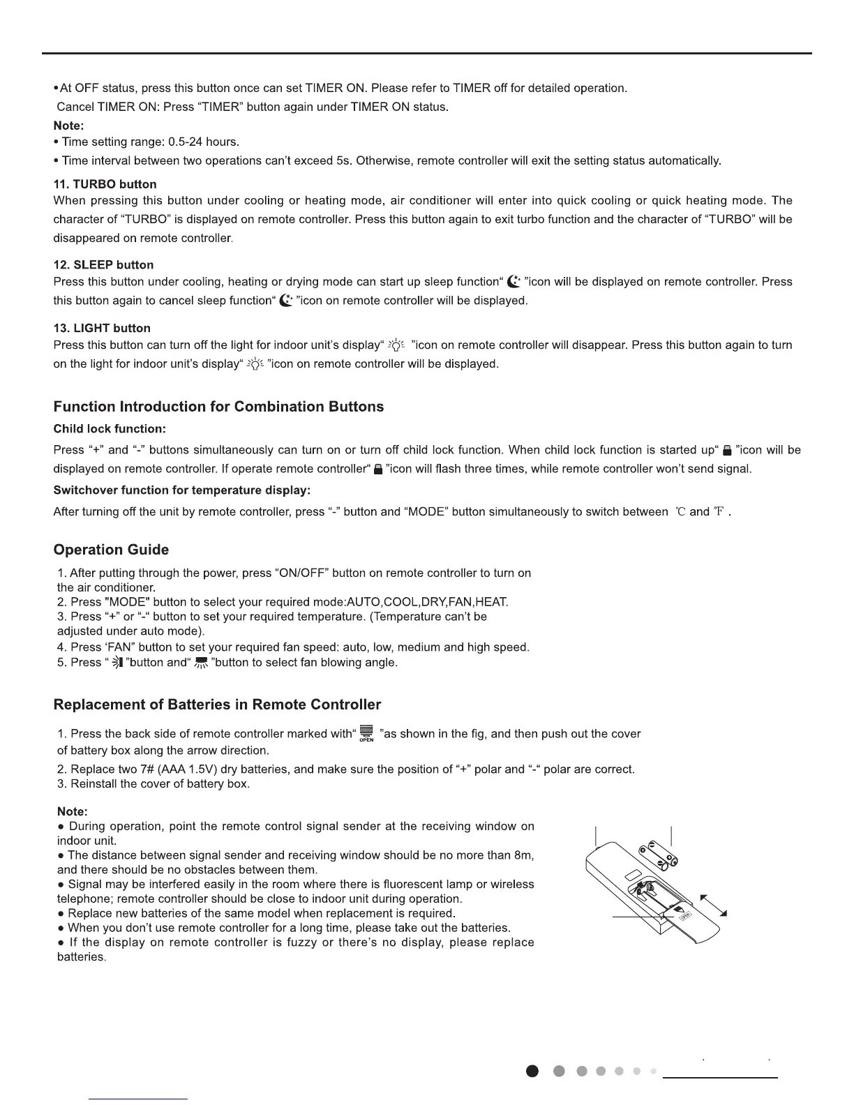 Gree YV1F7 - Function Introduction for Combination Buttons; Child Lock Functions; Switchover Function for Temperature Display
