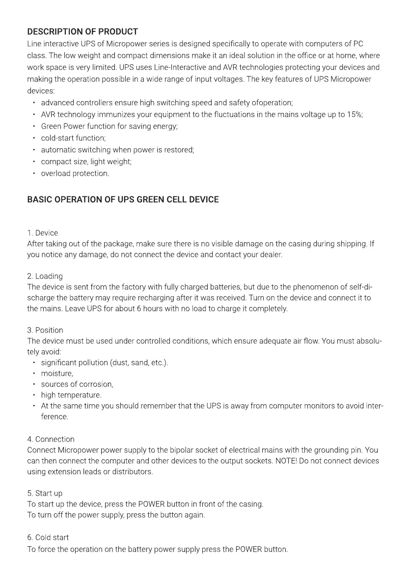 Green Cell POWER PROOF 600VA - Description of Product; Basic Operation of UPS Green Cell Device
