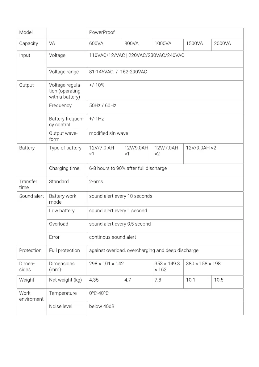 Capacity VA 600VA 800VA 1000VA 1500VA 2000VA