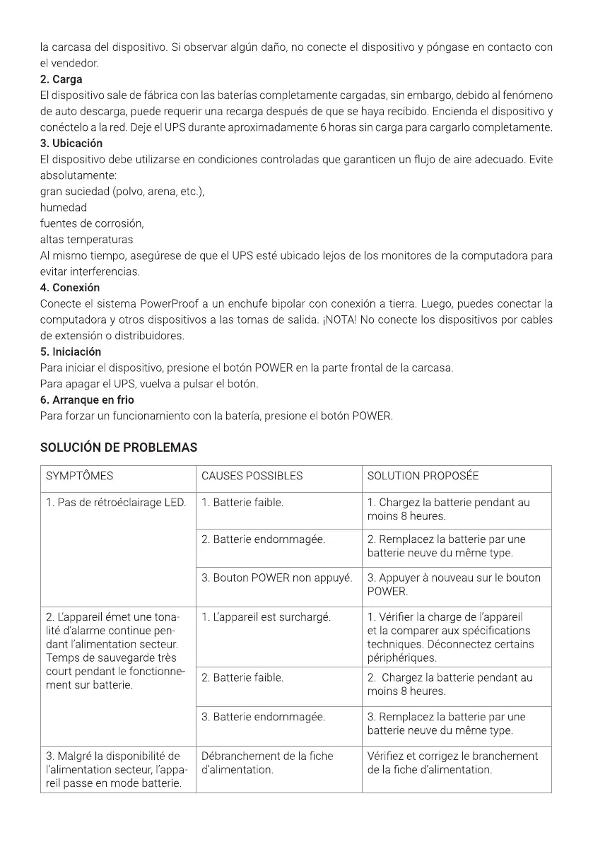 1. Pas de rétroéclairage LED. 1. Batterie faible. 1. Chargez la batterie pendant au