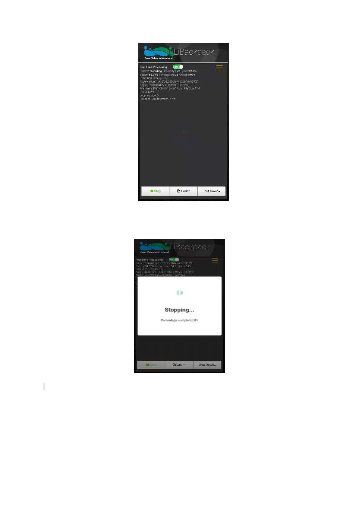When the data acquisition process is done, please walk in the “8” pattern again which will take about 1 minute before you press the Stop