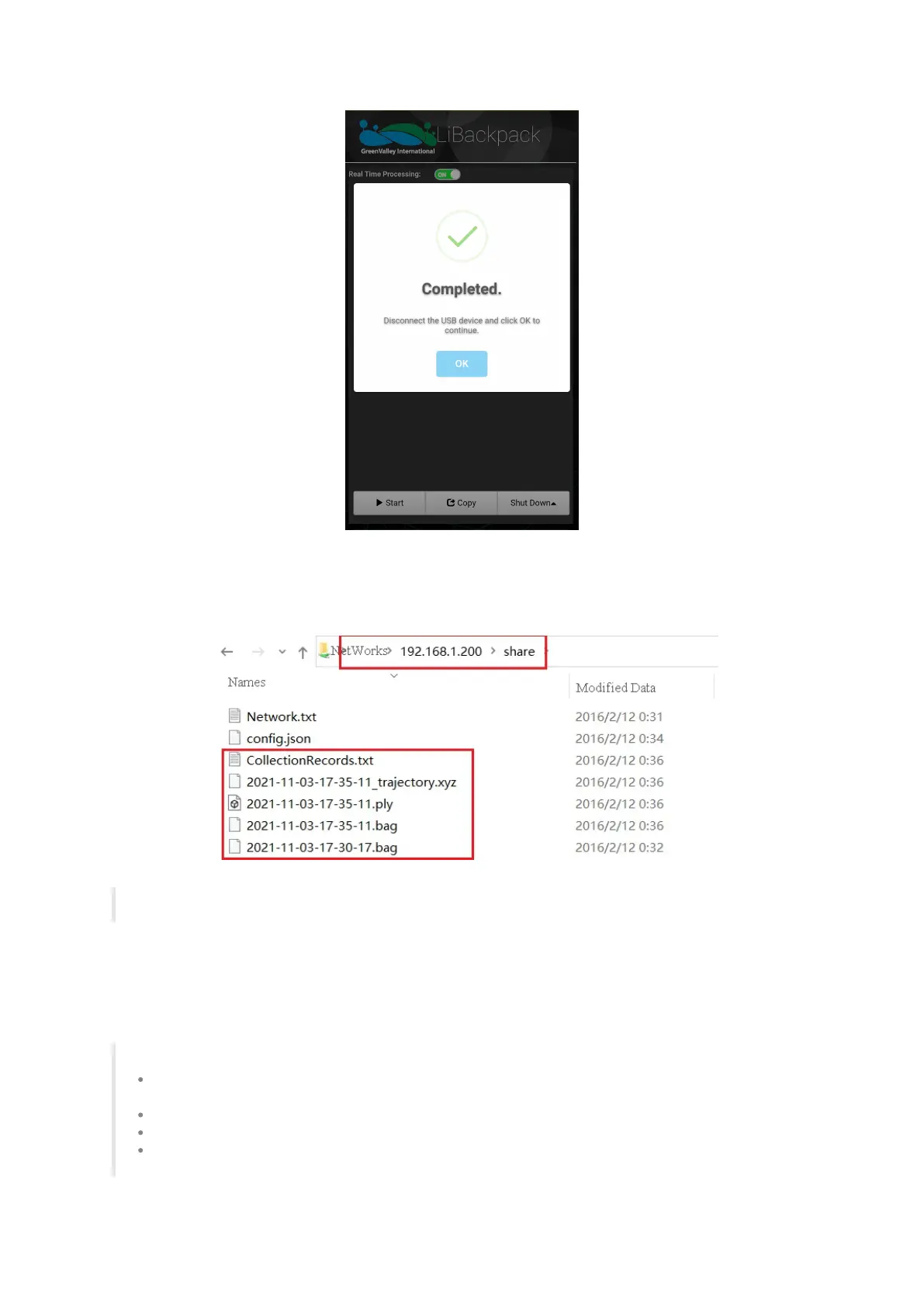 network, enter the internal storage space of the device, open the "share" folder, and select the collected .ply files, .bag files according to the