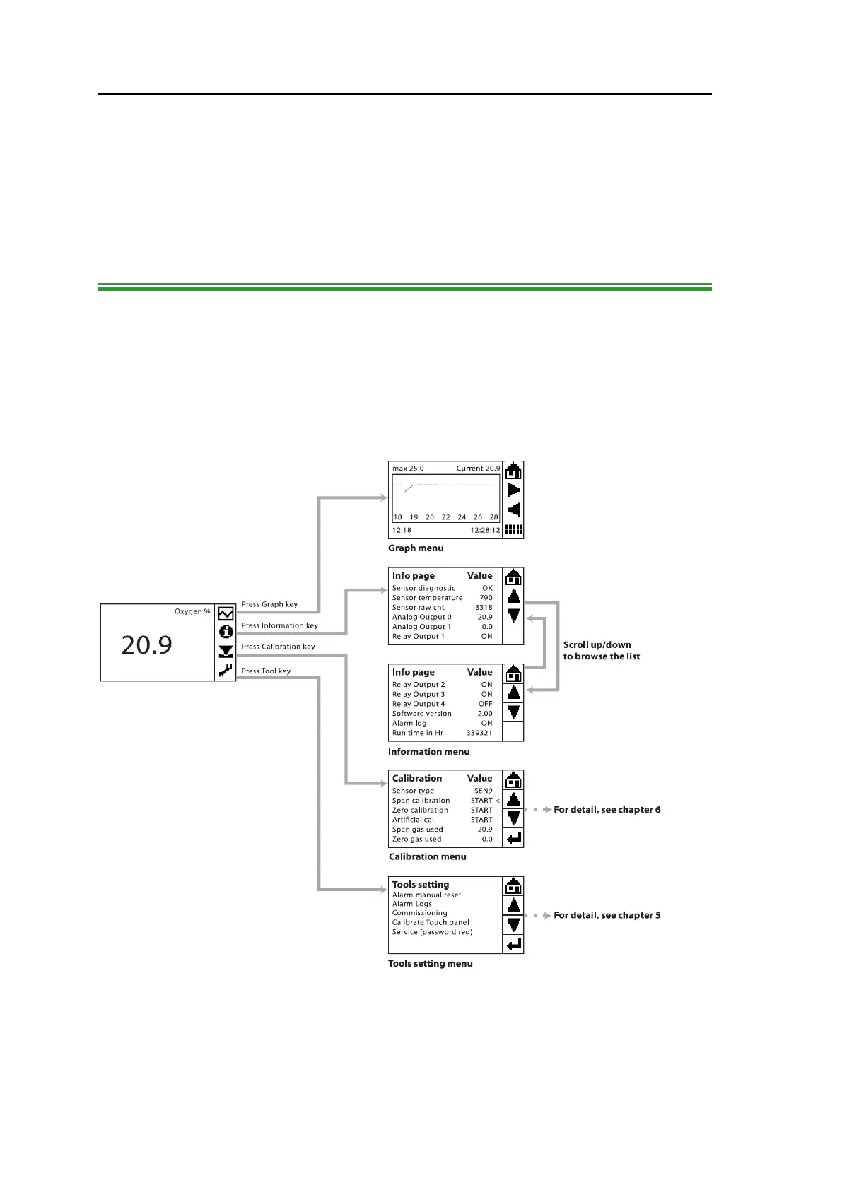 are connected to four different functional menus: Graph, Information, Calibration and