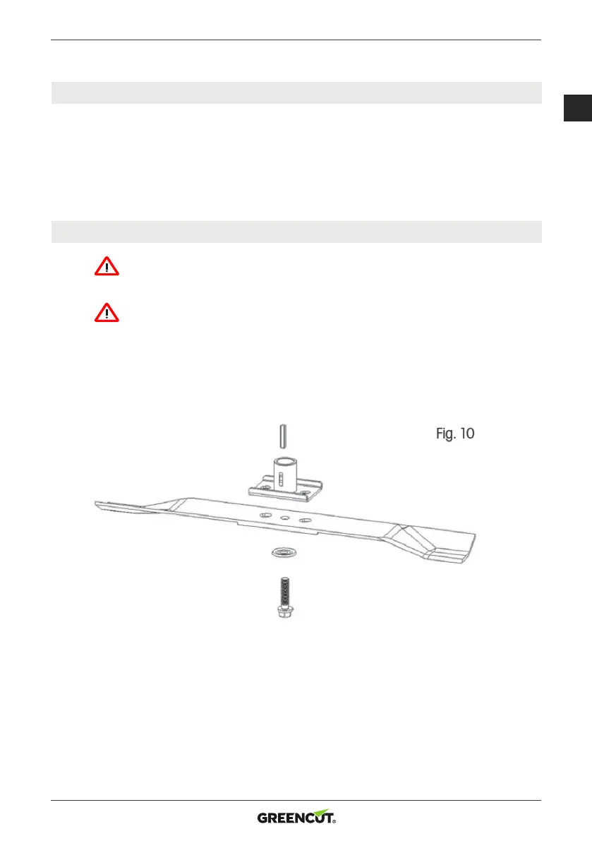 If you wish to replace the mowing blade, remove the bolt (Fig. 10). Perform the
