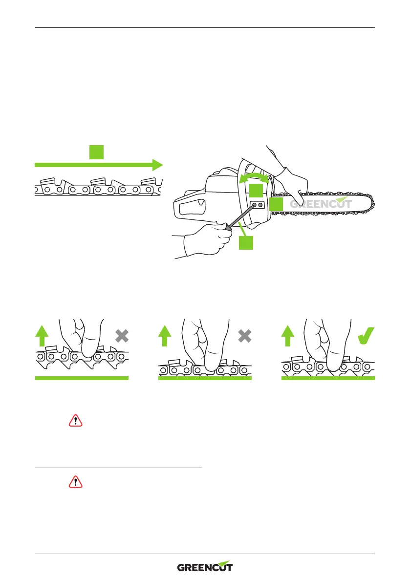 • Vous devez contrôler la tension d’une chaîne neuve après 5 minutes d’utilisation. Pour une