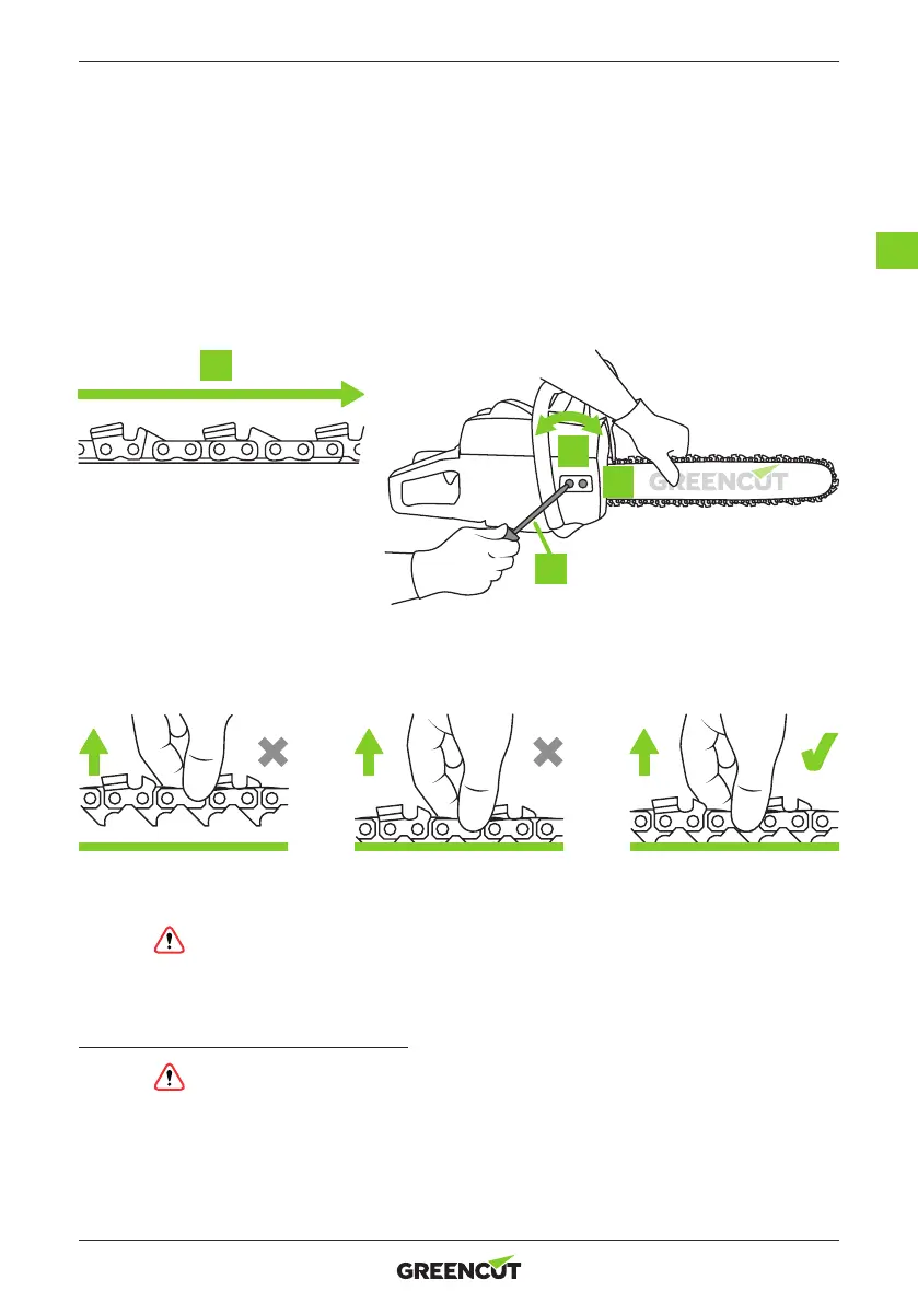 7. Während Sie die Spitze des Schwertes halten, stellen Sie die Kettenspannung ein, indem Sie die