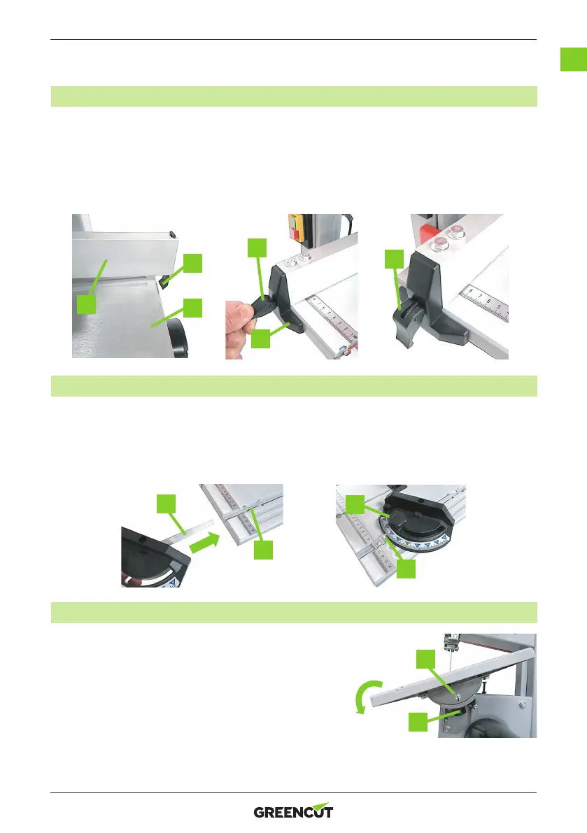 1. Enganche la punta (I) en el extremo de la cerca (G) sobre el extremo de la mesa (H).