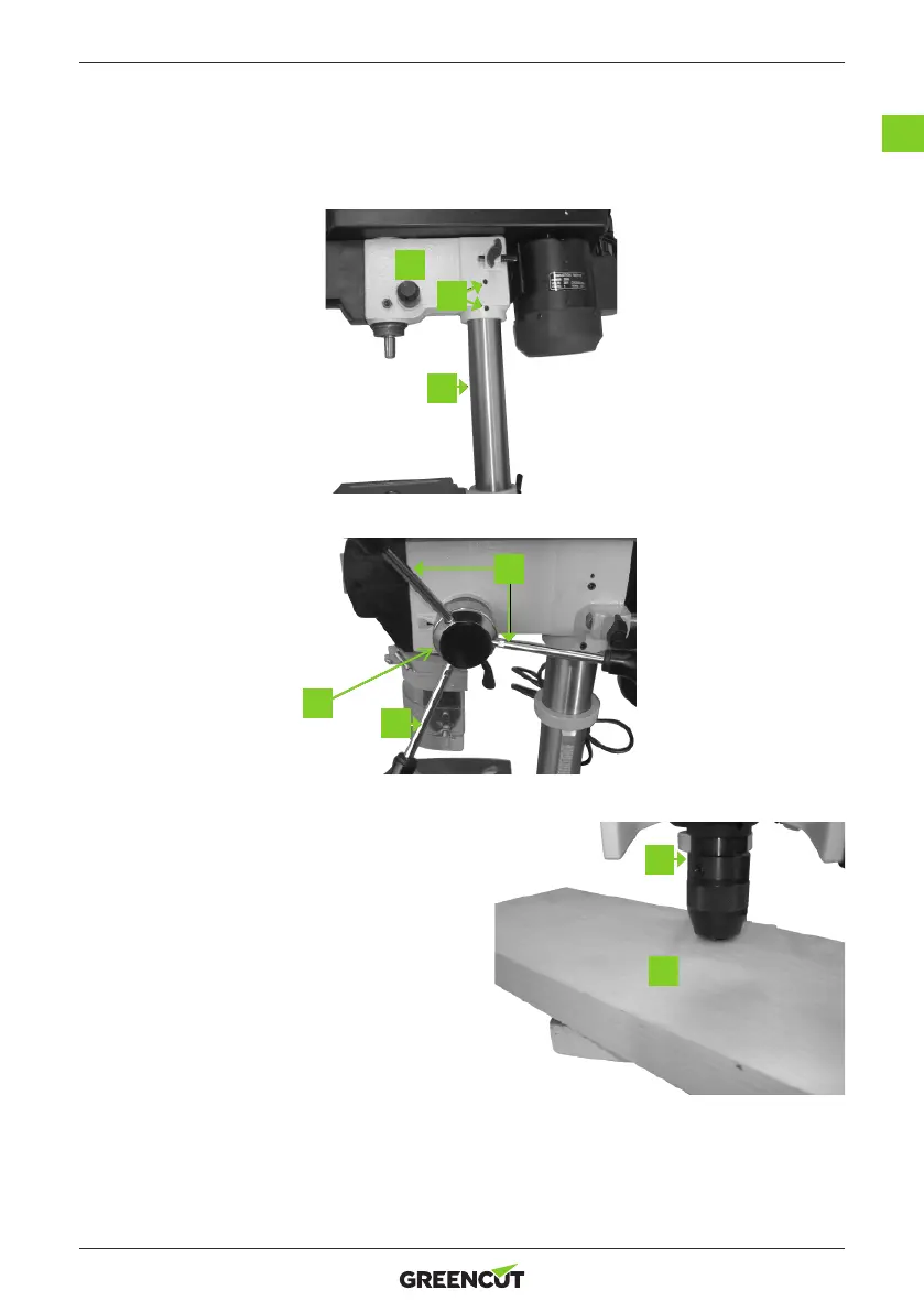 base. S’assurer que la tête de forage est complètement alignée sur la colonne, puis la xer en serrant les vis