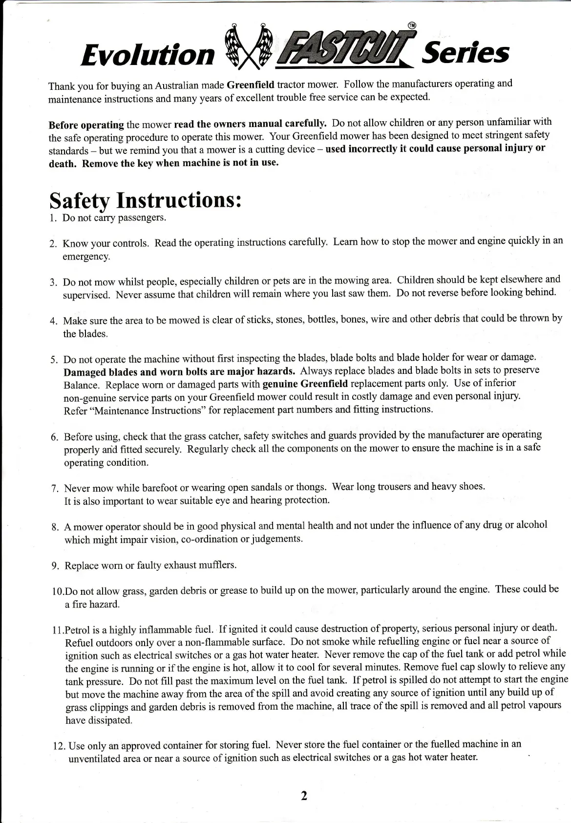 Greenfield Evolution Fastcut Series - Safety Instructions