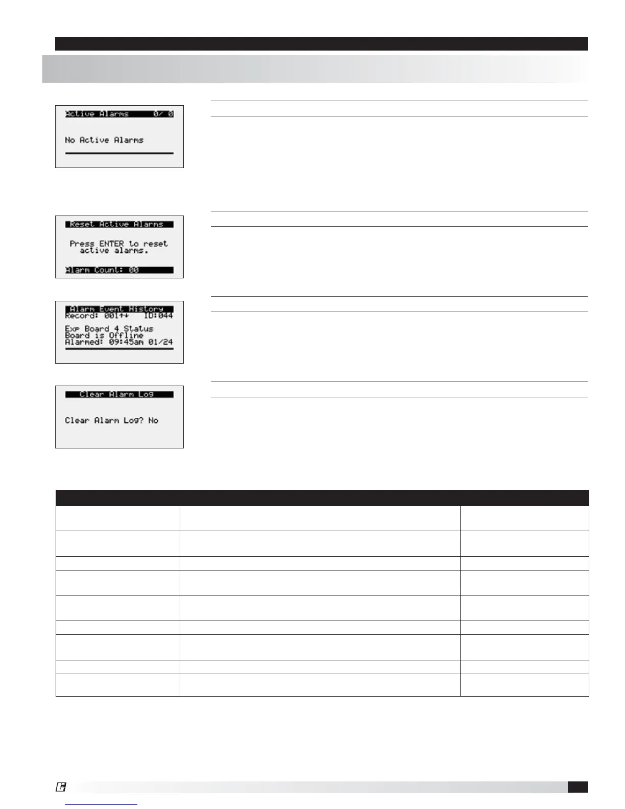 The Alarms menu allows the user to view active alarms, reset active alarm (if