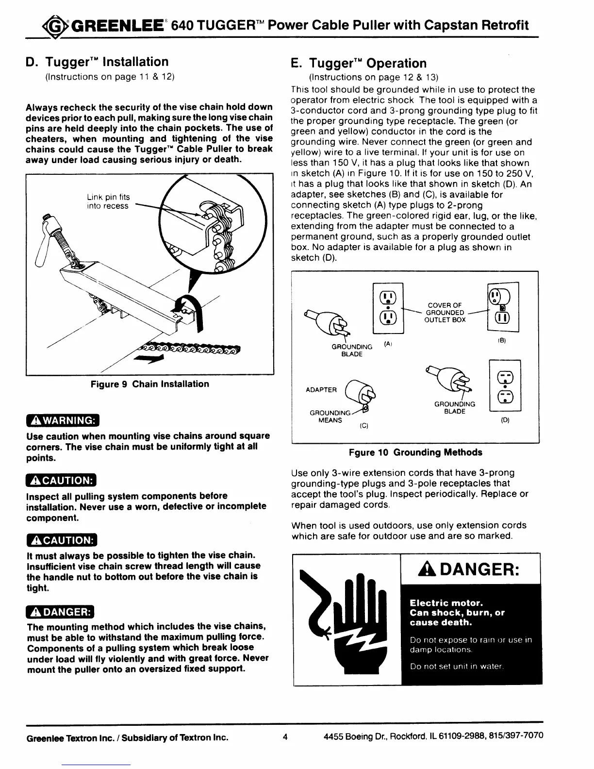 Greenlee 640 Tugger - Tugger Installation; Tugger Operation; Grounding