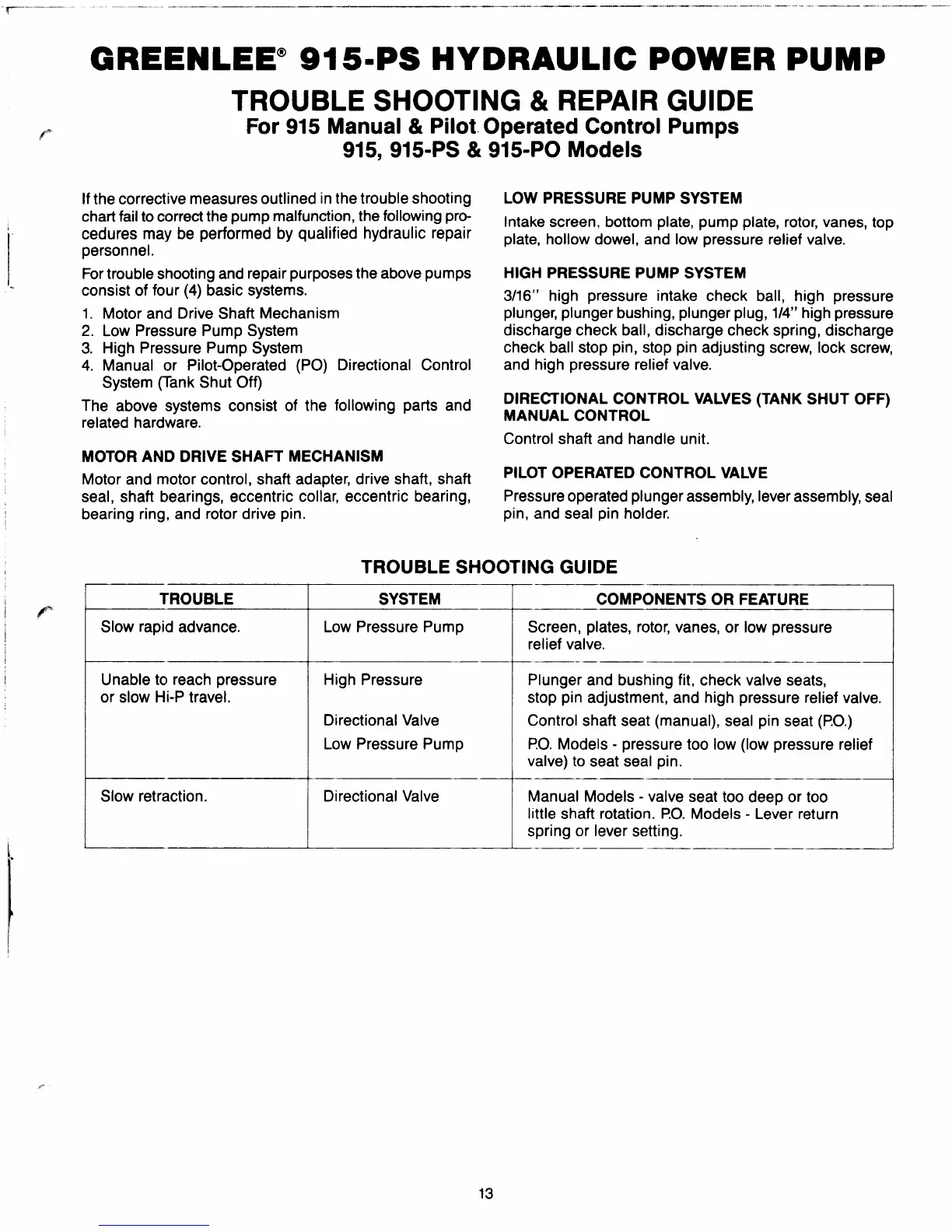Greenlee 915-PS - Troubleshooting and Repair Guide; Troubleshooting Guide