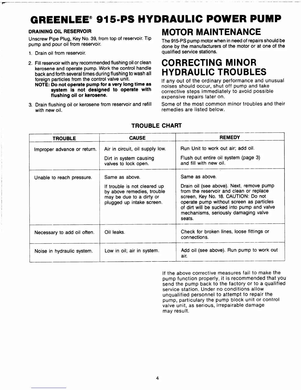 Greenlee 915-PS - Motor Maintenance and Troubleshooting; Correcting Minor Hydraulic Troubles