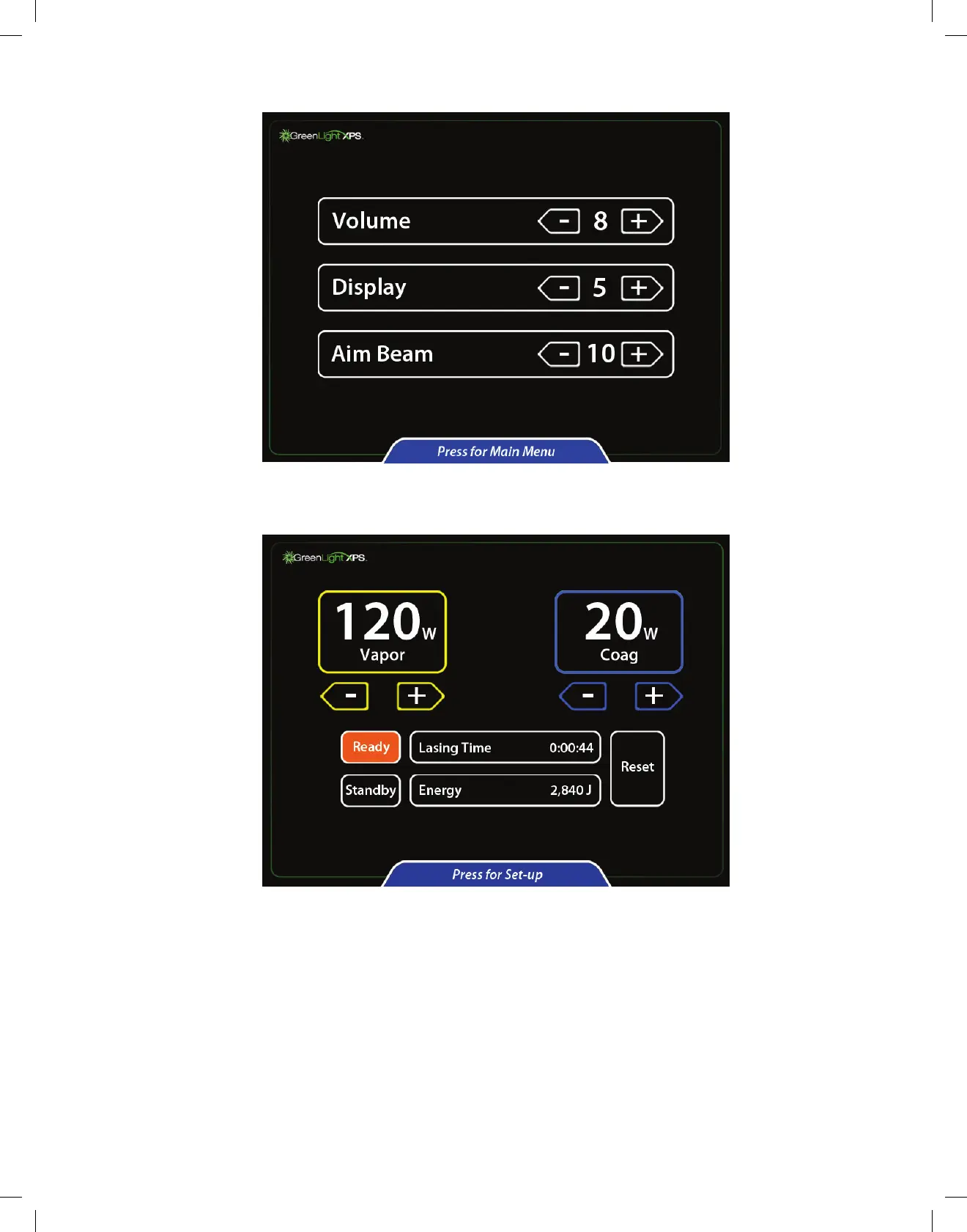 13. To change the aiming beam intensity, display intensity, or audio volume, touch Press for Set-up at the bottom of the main screen.