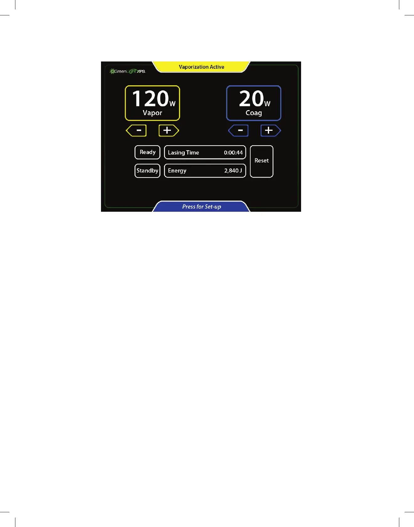 23. Laser energy will be emitted when a footswitch is pressed. The Active mode (Vaporization Active or Coagulation Active) is displayed at the