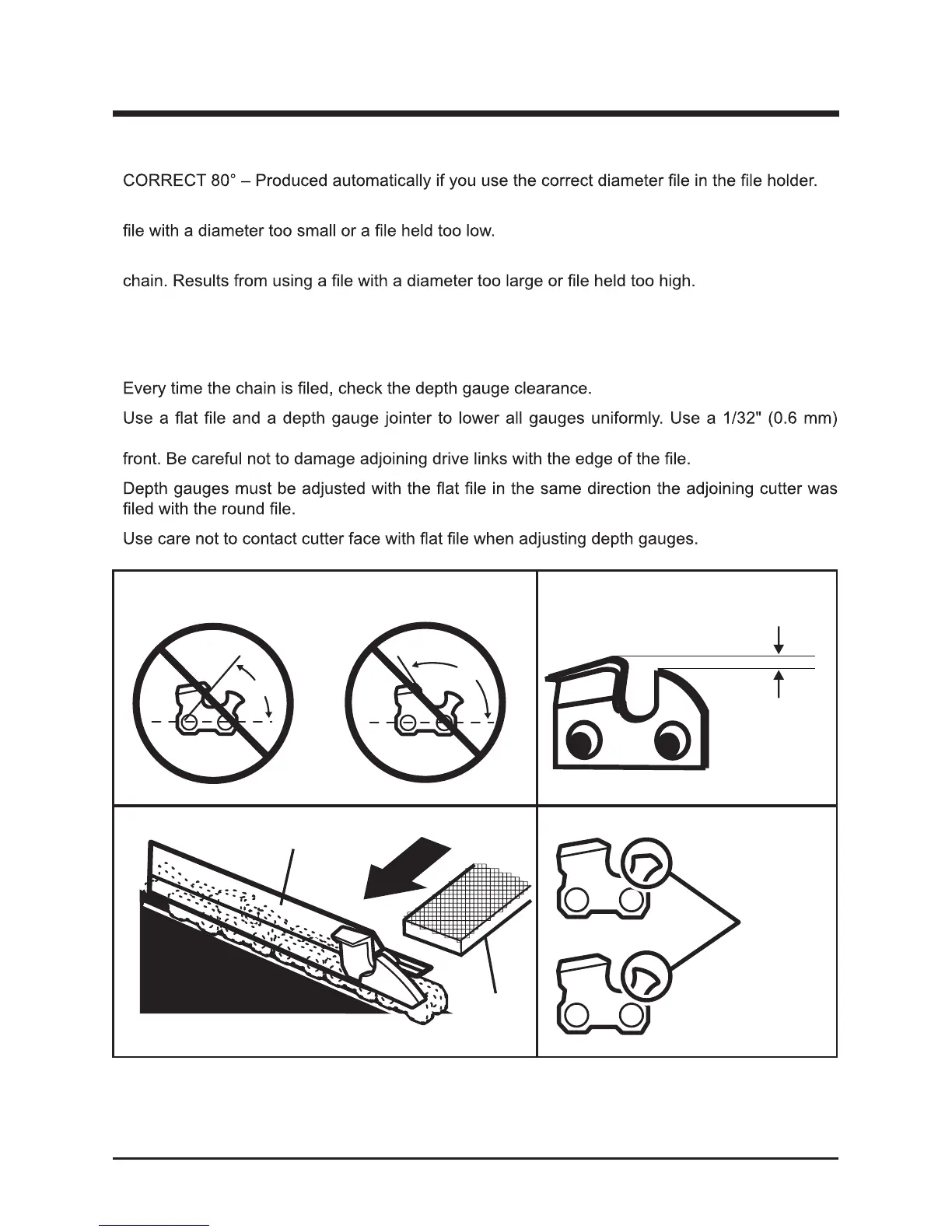 • Maintain the depth gauge at a clearance of 1/32" (0.6 mm) Use a depth gauge tool for checking