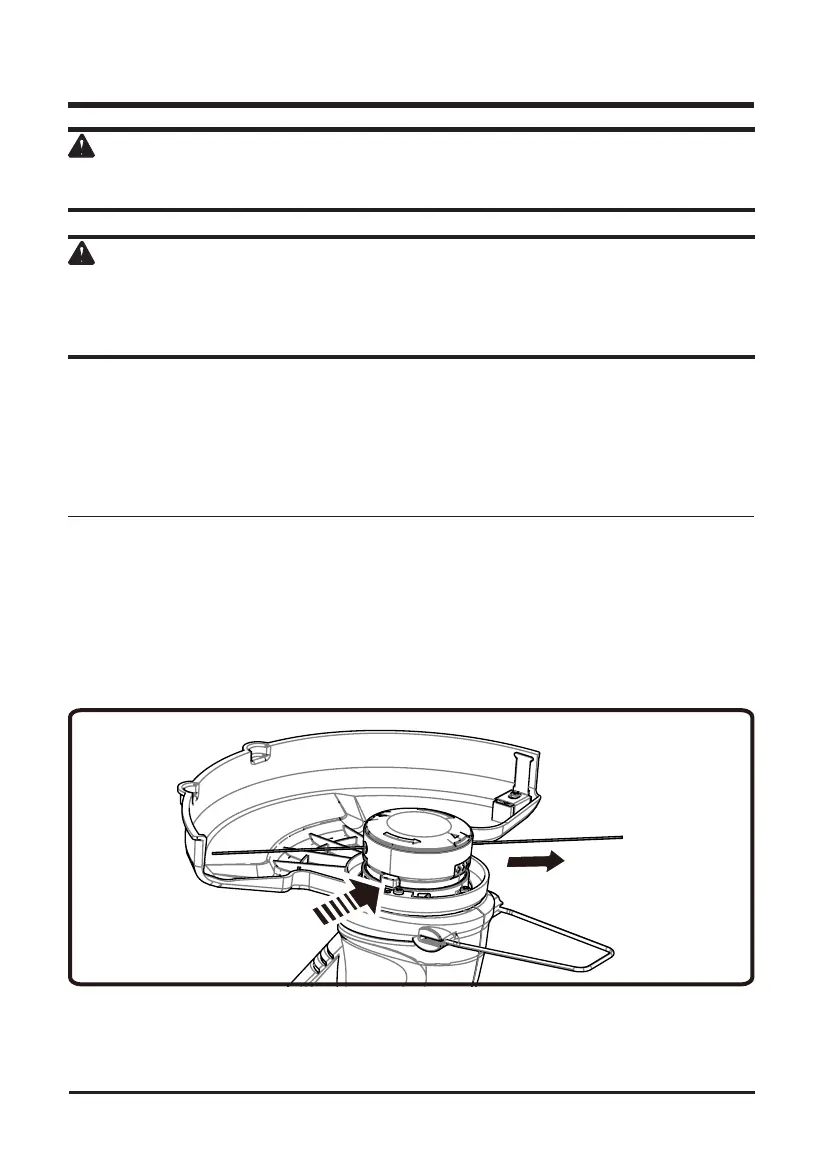 • Débrancher la taille-bordures à ligne et enfoncer la la retenue de bobine et tirer sur le ou le