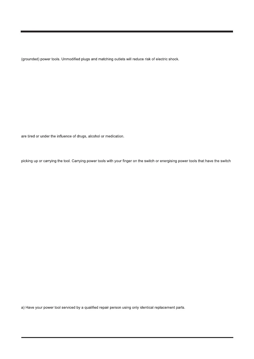 a) Power tool plugs must match the outlet. Never modify the plug in any way. Do not use any adapter plugs with earthed