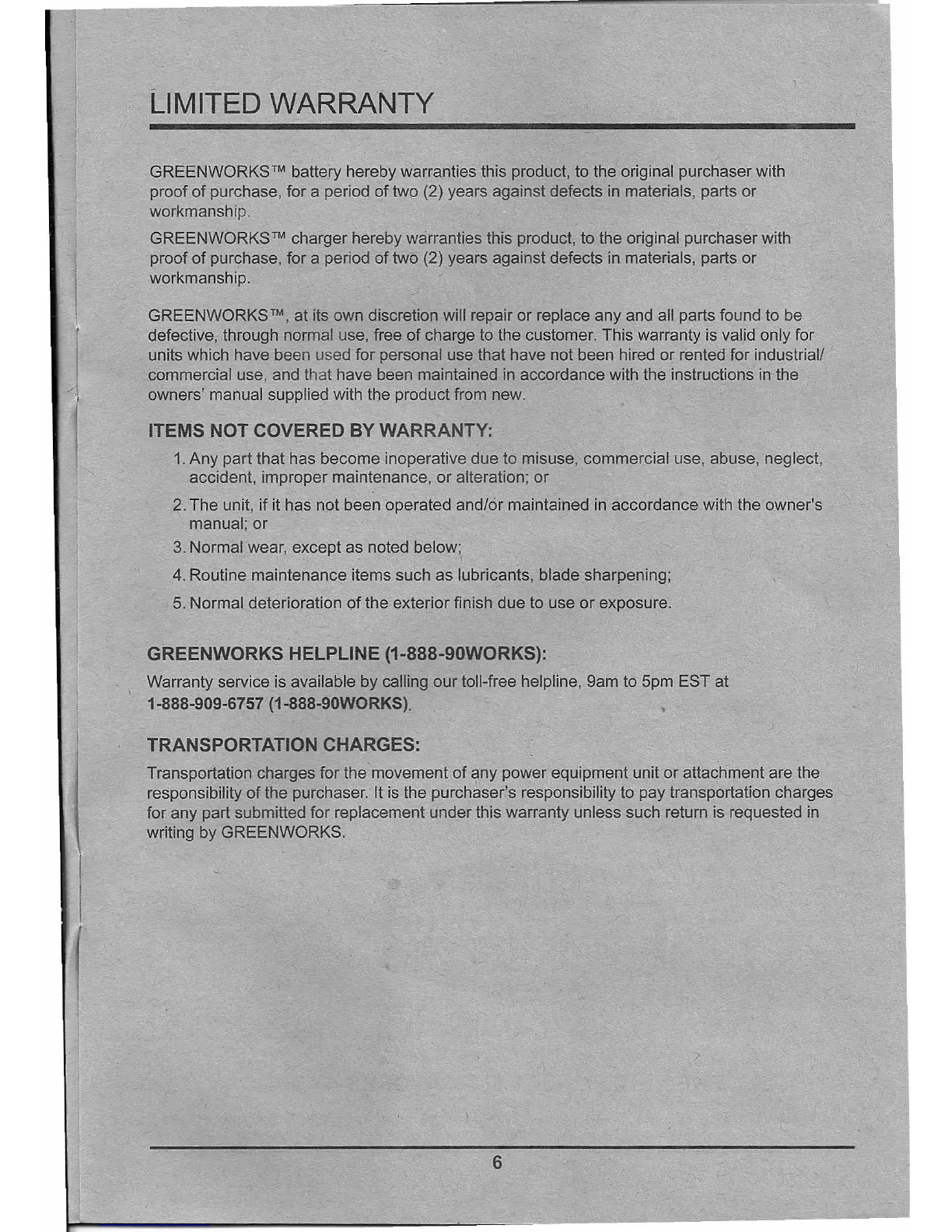 GREENWORKS HELPLlNE (1-888-90WORKS):