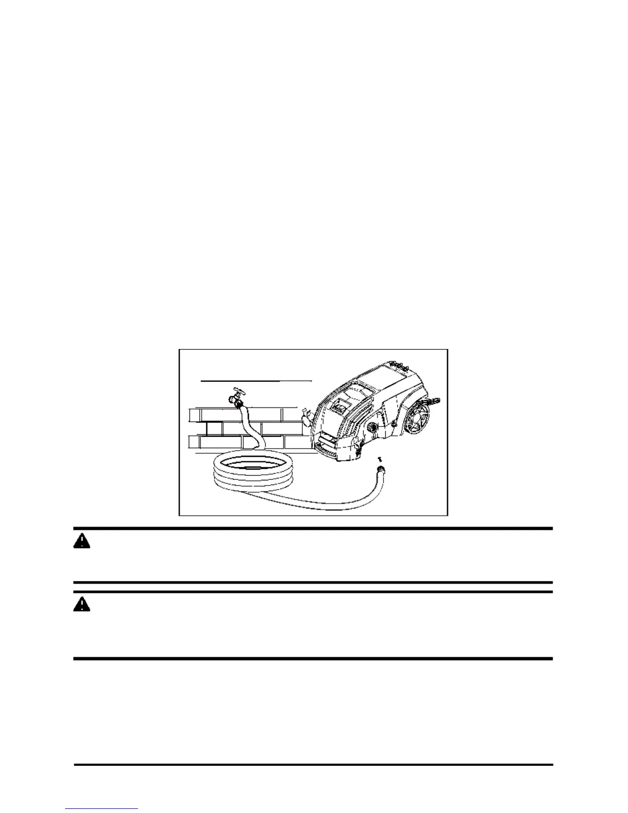 The water supply must come from a water main. NEVER use hot water or water from pools,