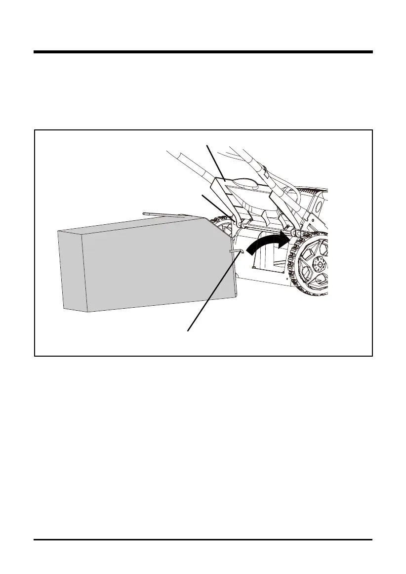 While holding the rear cover up, place the hanger hooks (2) of the grass catcher bag into