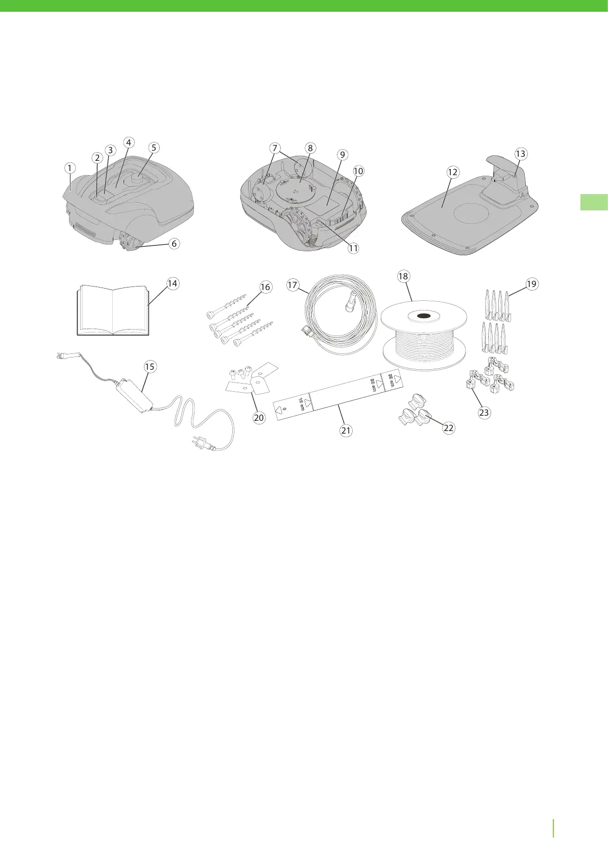 Déballez la tondeuse et le matériel d'installation. Assurez-vous que toutes les pièces en Figure 1 sont incluses