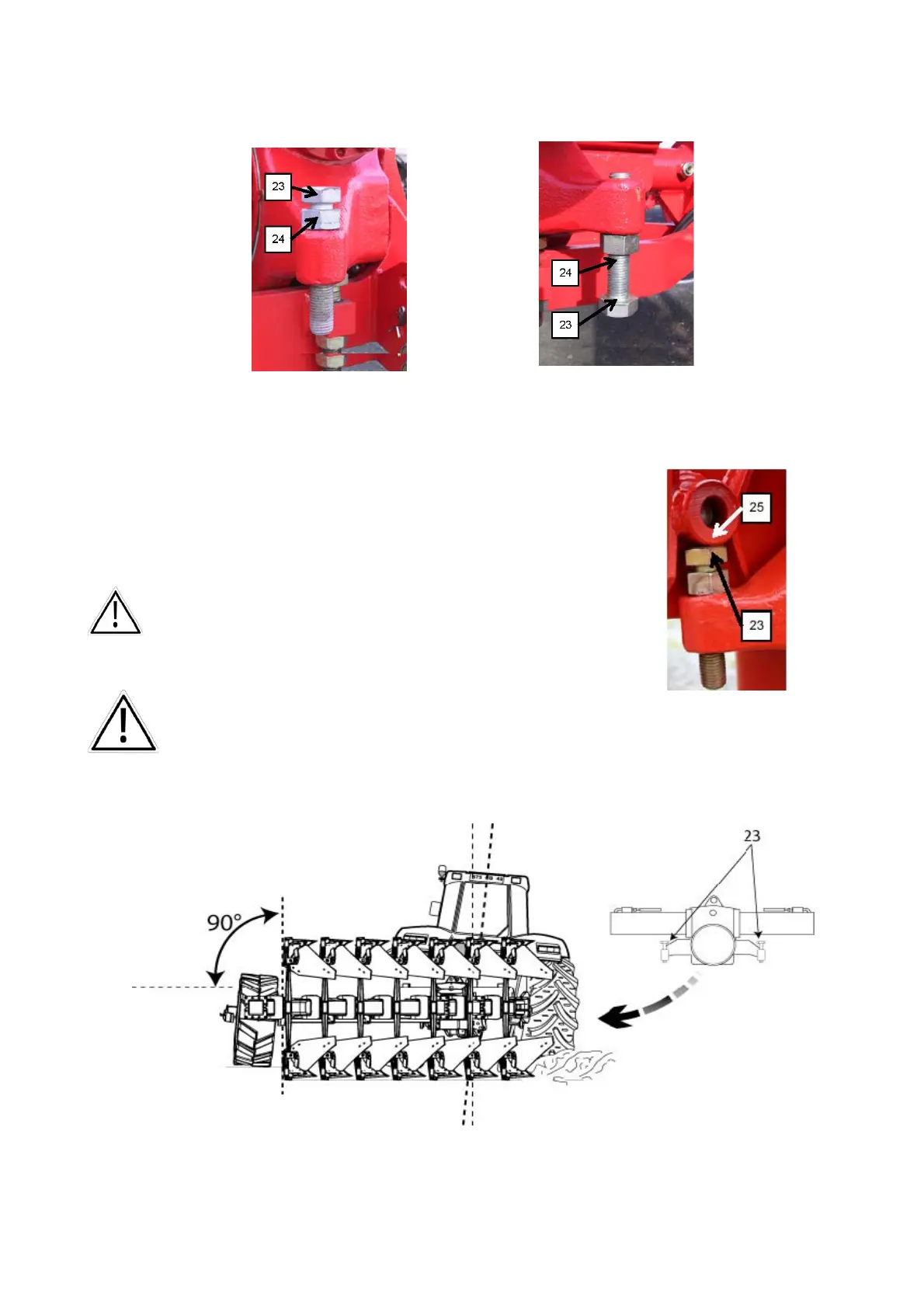 ¾ In the case of plough in the furrow the bolts (23) and check nuts (24) should be above.
