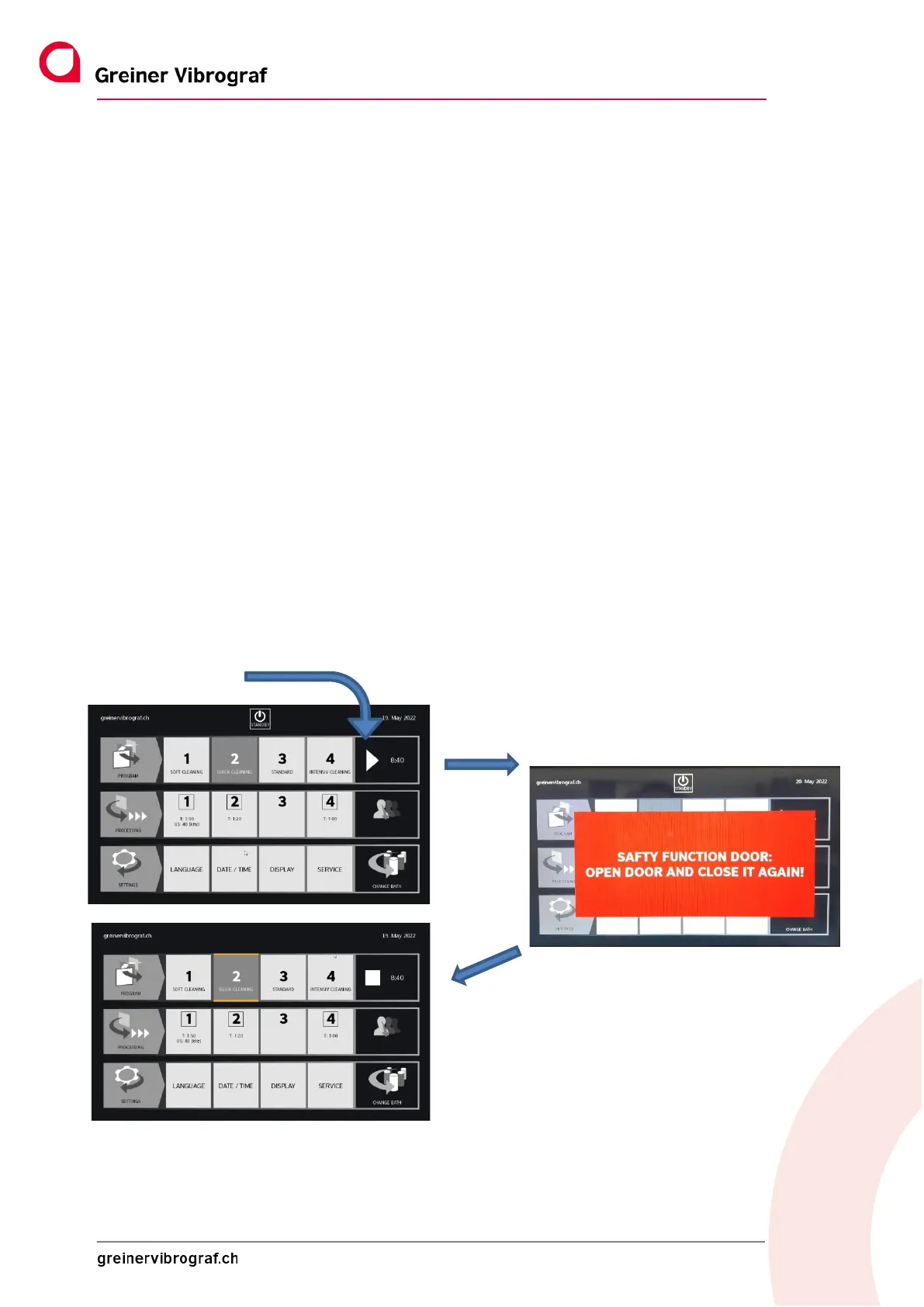 The safety function of the door switch is checked before each programme starts. The door has to be opened