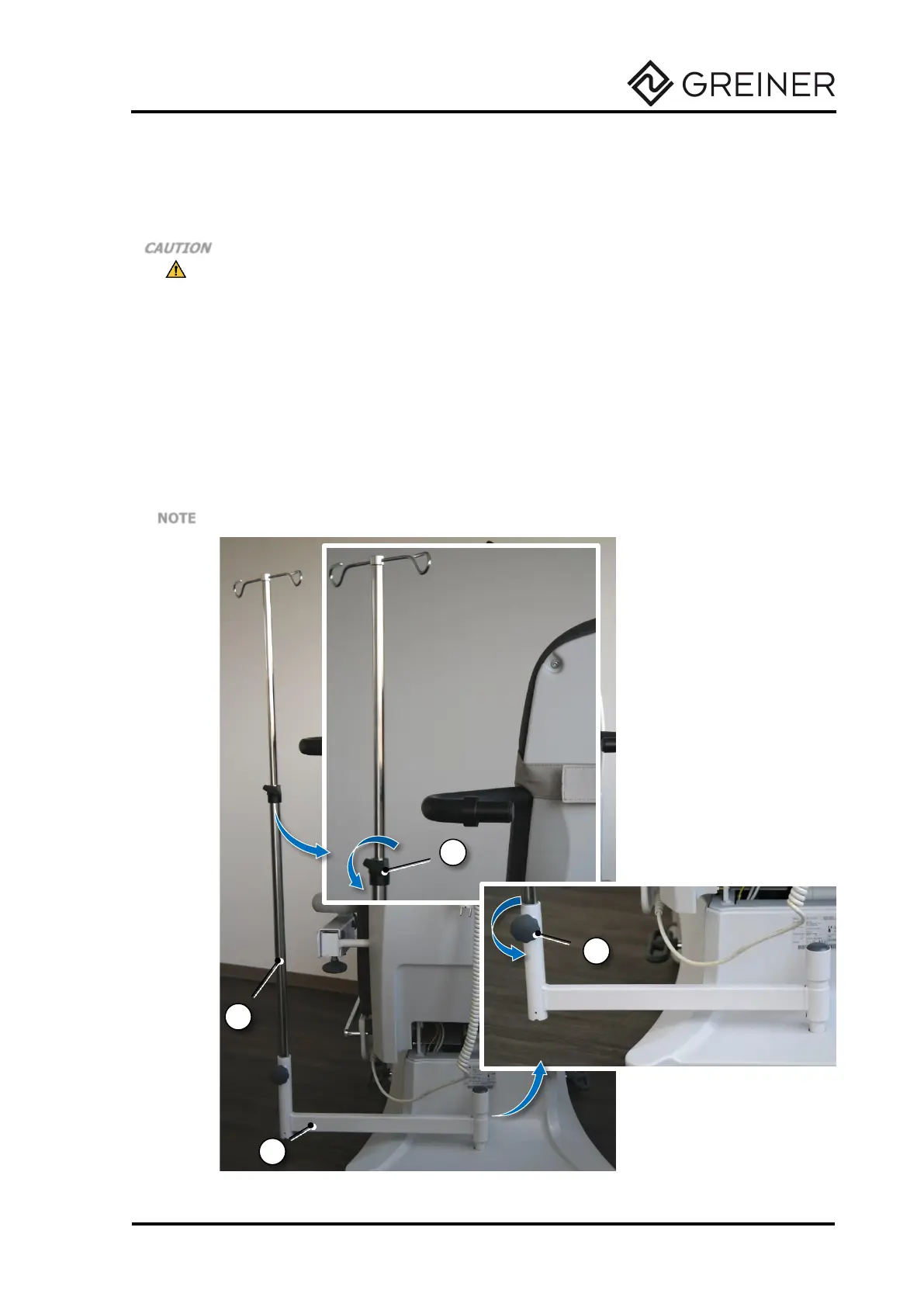 continuously adjusted. To do this, loosen the clamping screw (4) on the infusion rod. Hold the upper pull-out part