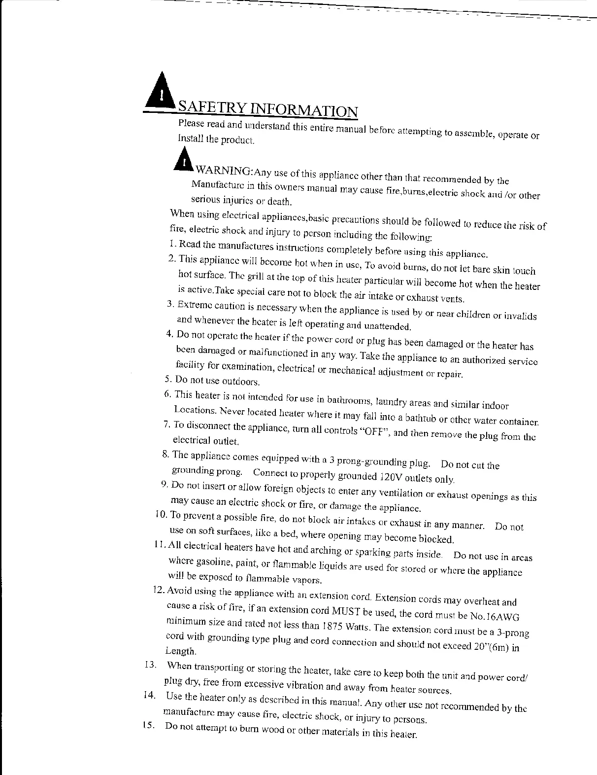 Do not operate the heater