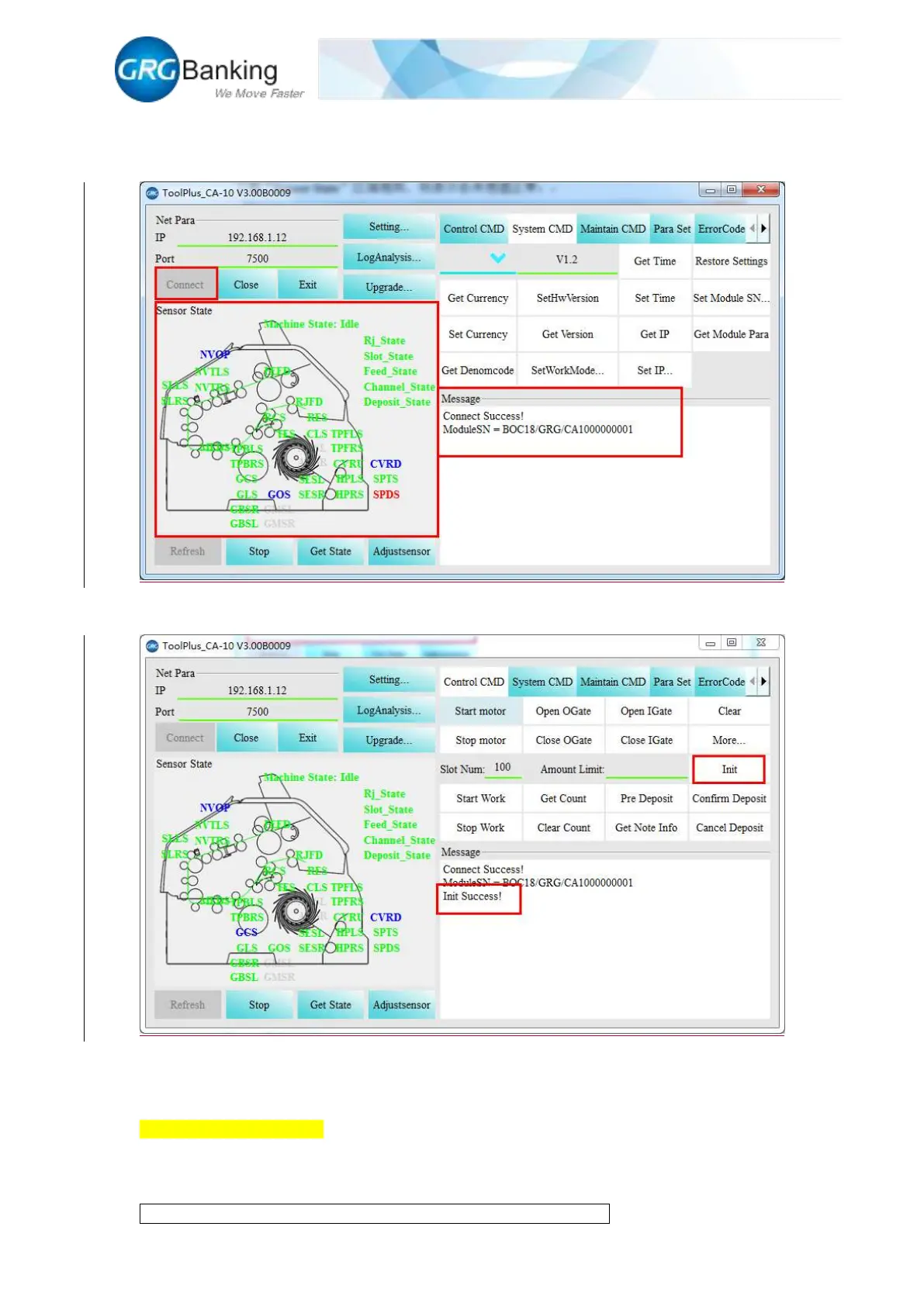 Click the “Init” button to initialize CA10 successfully and display “Success” in the “Massage”