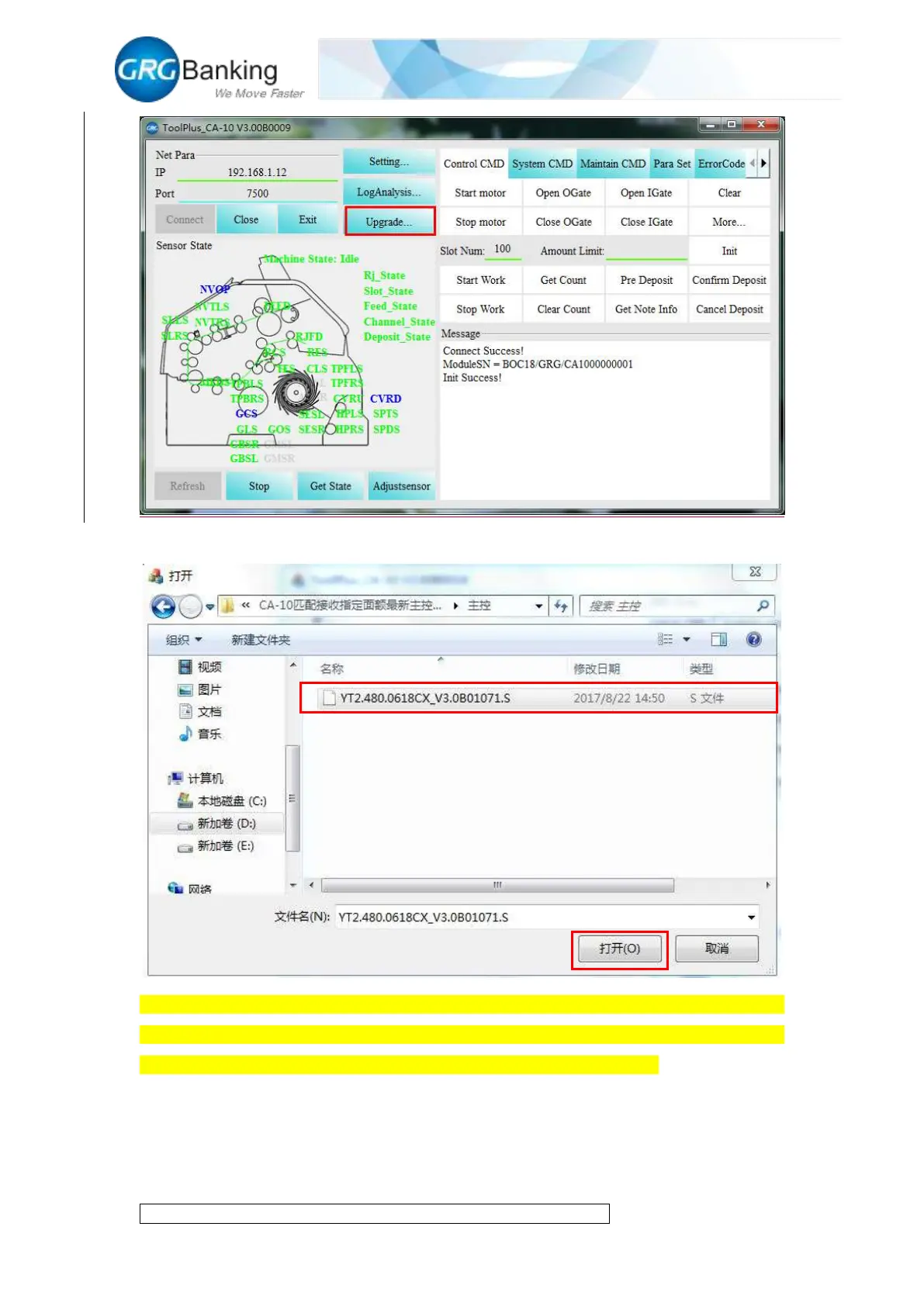 Pitch on the upgrade package of the main control board and then click the “Open” button;
