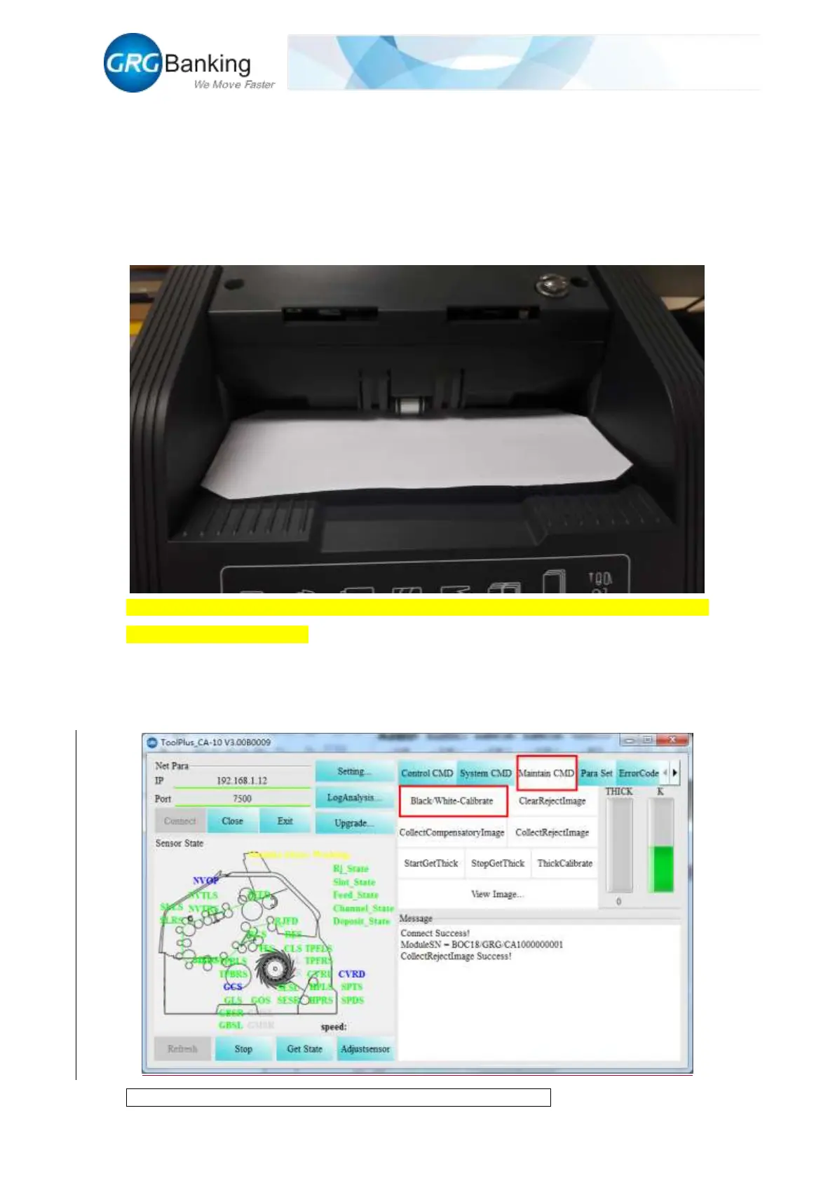 3) Click the “Maintain CMD” and “Black/White calibrate” to feed the calibration paper and