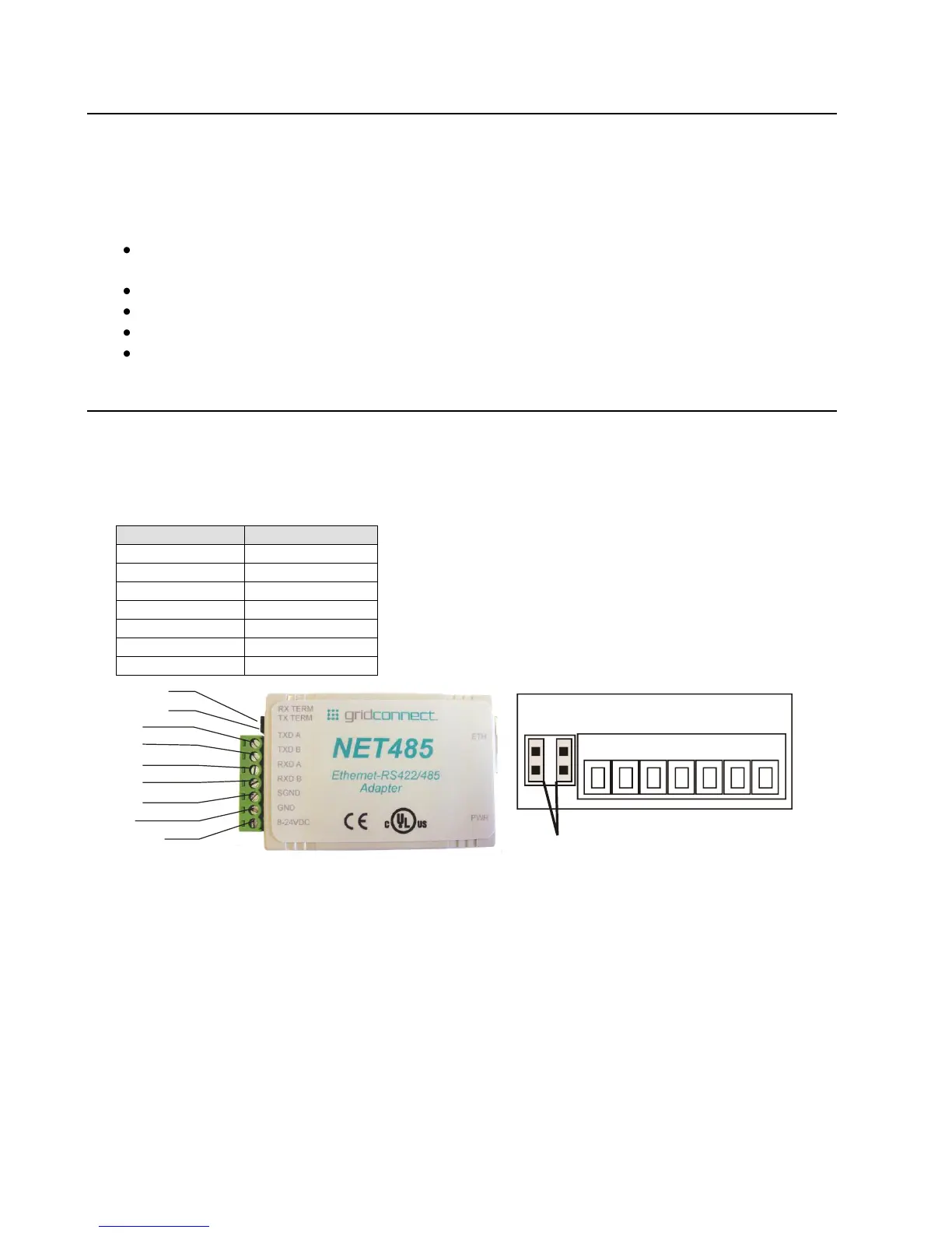 The table below lists the RS422/485 signals for the NET485. The RS422/485 and power interface is a 7-pin