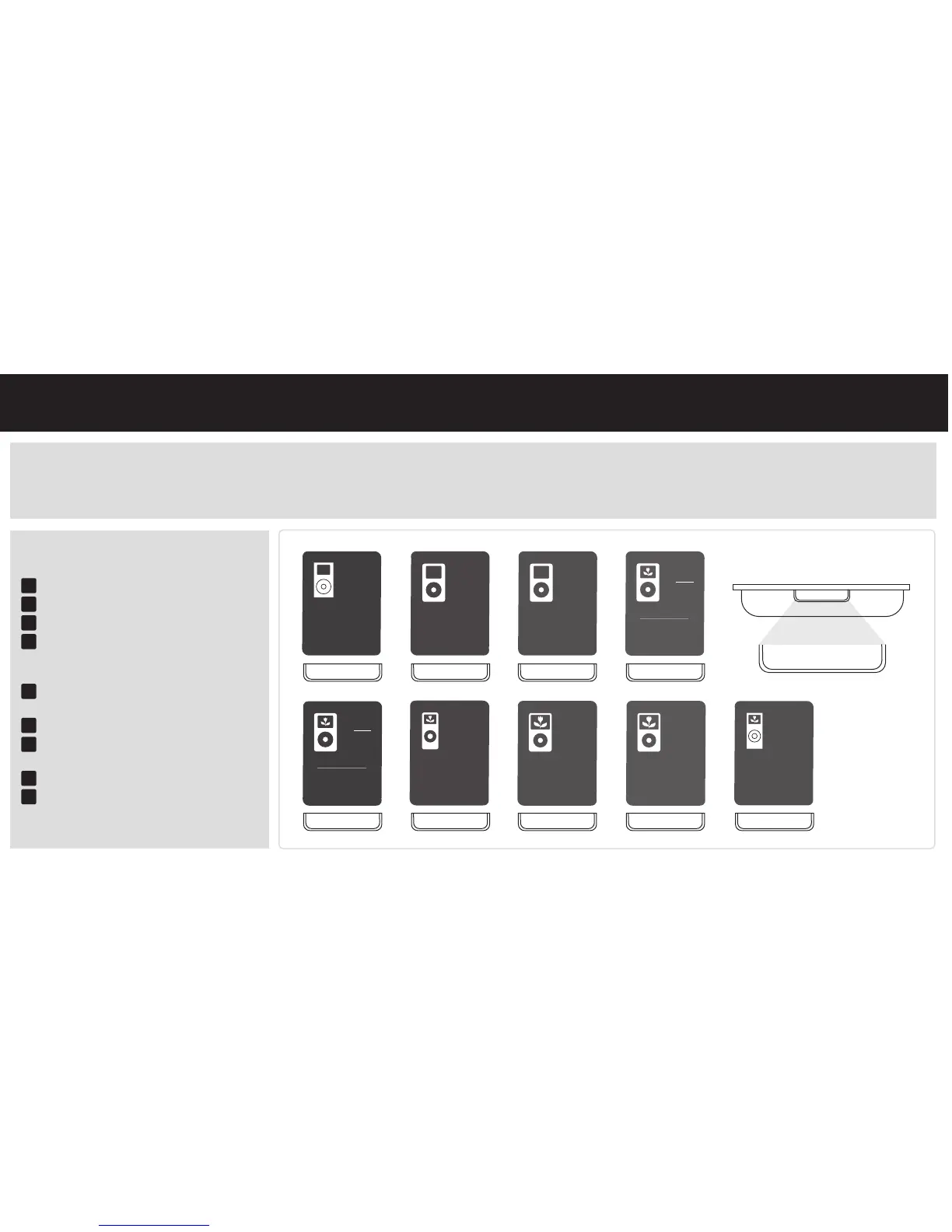 Nine dock adapters are included to custom fit your iPod to Evolve’s dock. Use the chart below to choose the right adapter for your iPod. The nine