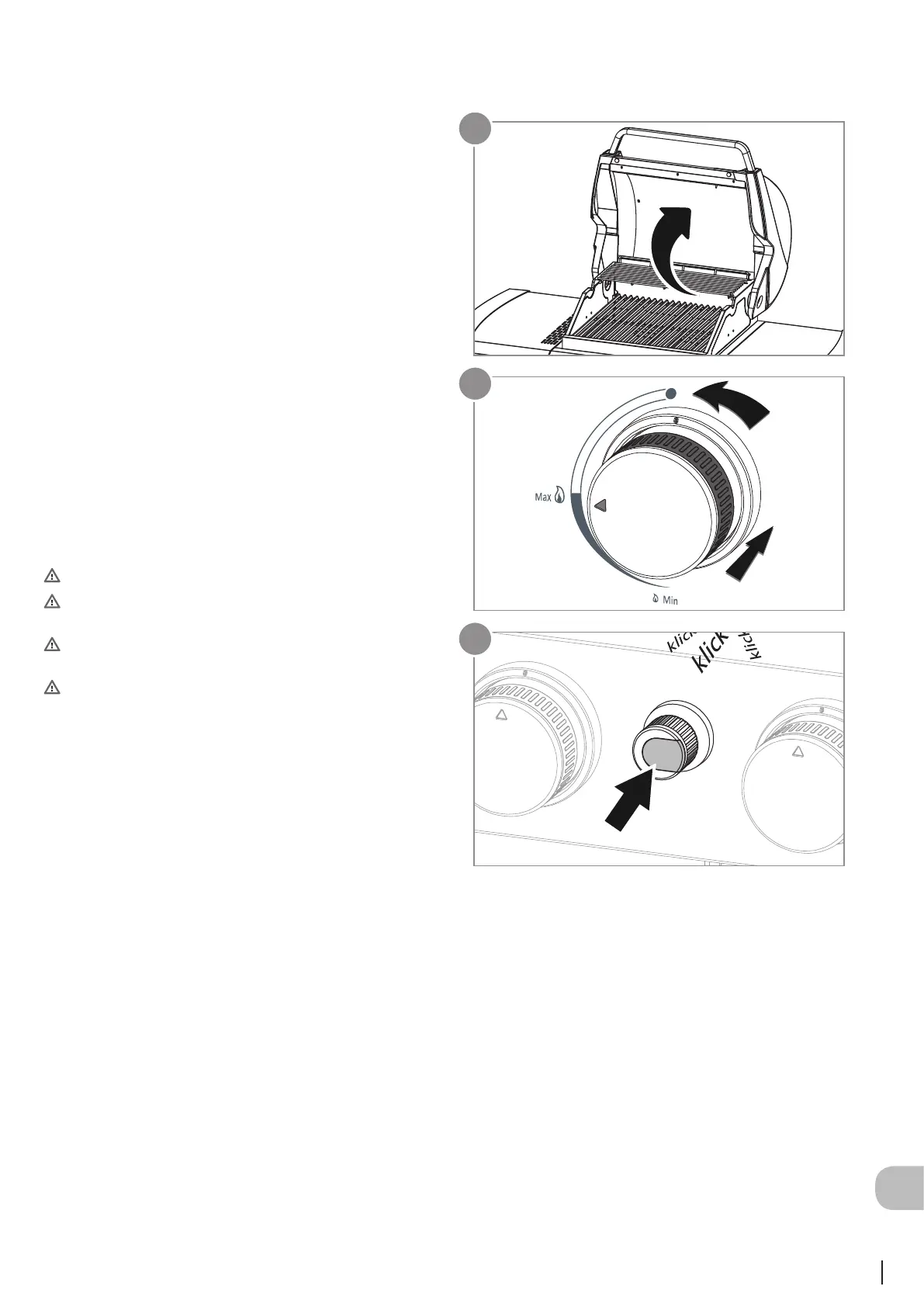 4. Pakartotinai spauskite pjezo uždegiklį (3), kol degiklis