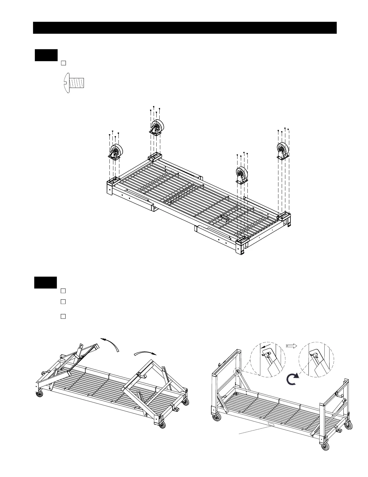 Install Casters to each Cart Leg.(Tighten securely using 16 of 1/4"x1/2" Phillips Head Screws).