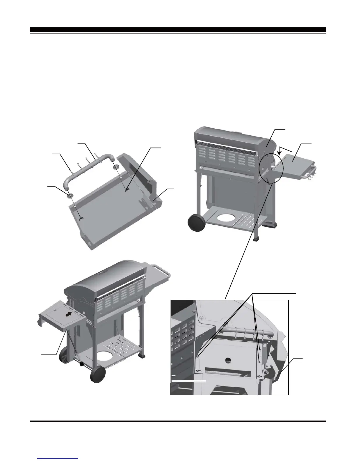 2) Install left side shelf (7) onto grill body (30) with 4pcs M5 x 16 bolts which are pre-installed on the