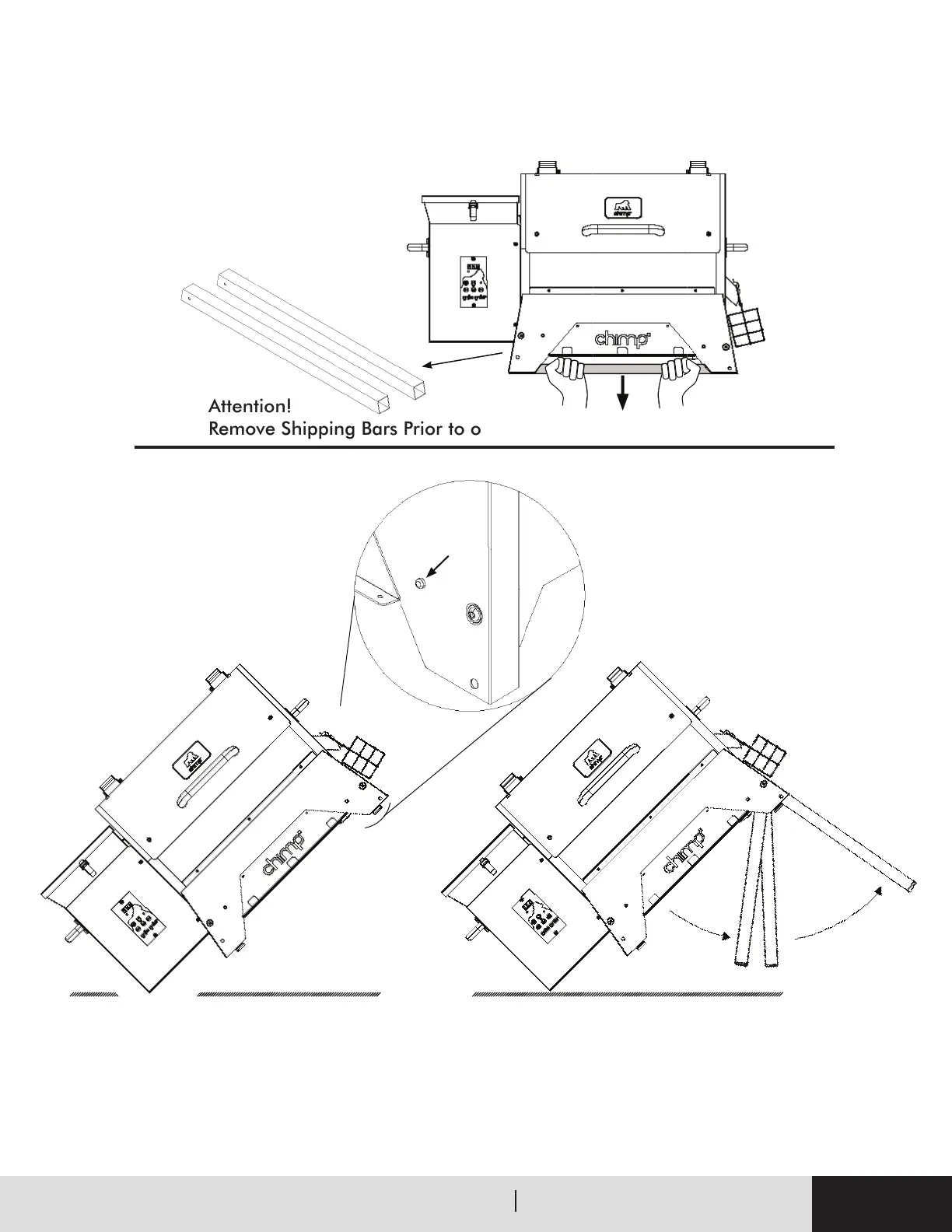 STEP 1 - Tilt grill up on the hopper edge illustrated in (FIG 1). Push in the metal detent on each side of the