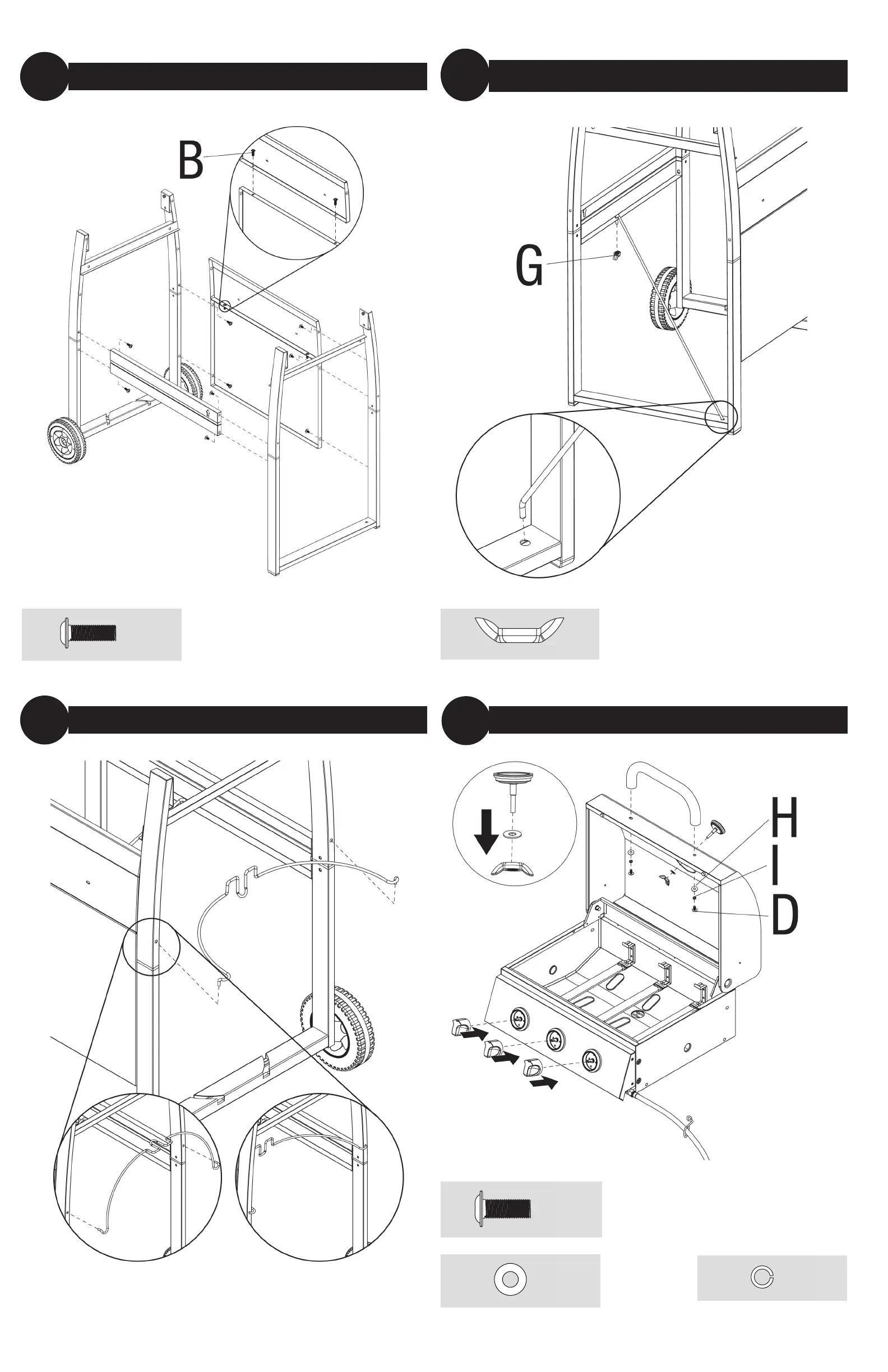 GrillBoss GBC1306J - Assembly Instructions: Supports and Fixtures; Front;Rear Panels and Gas Tank Retainer; Handle, Knobs, and Gauge Installation