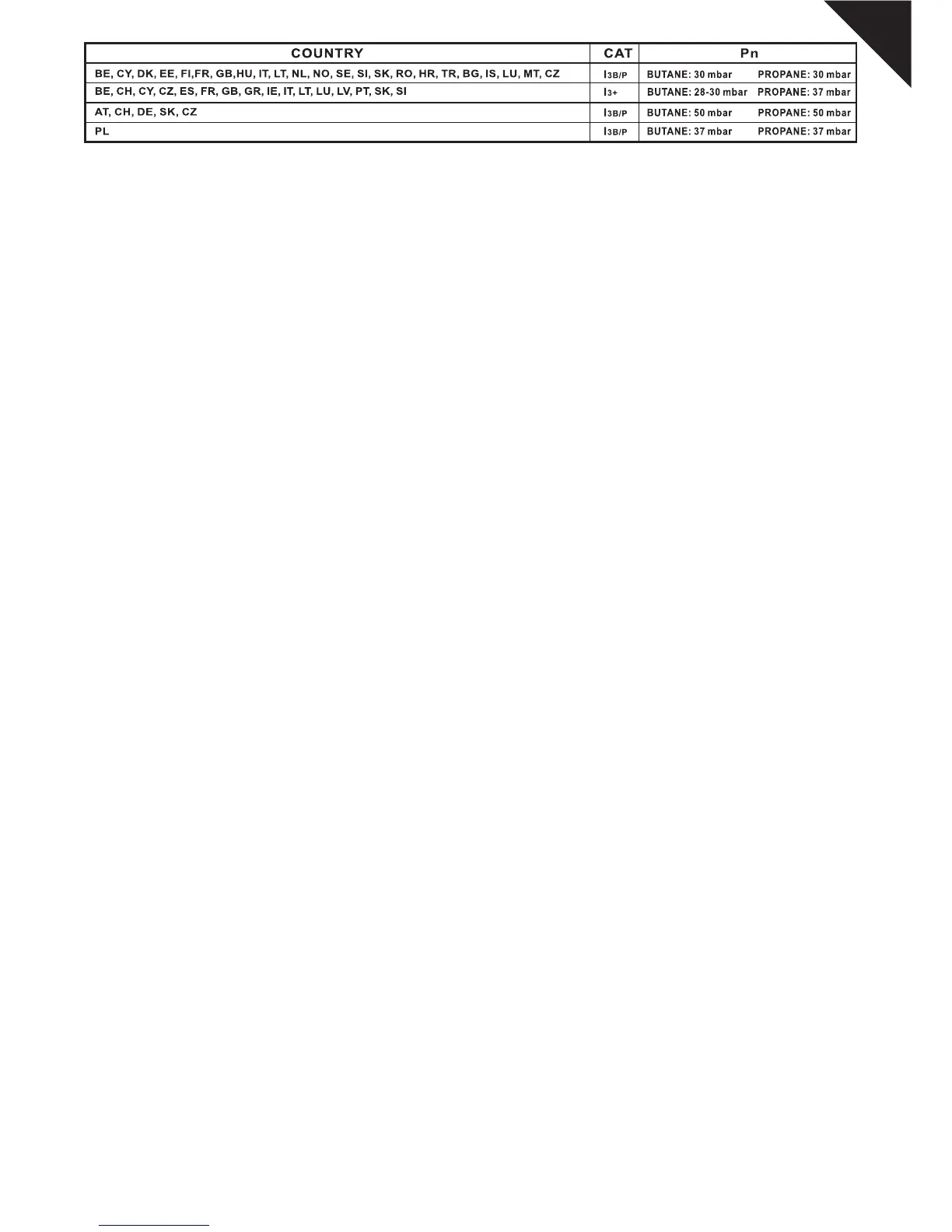or propane at 37 mbar, or butane/propane mixtures at 30 mbar, or butane/propane mixtures at 37 mbar,