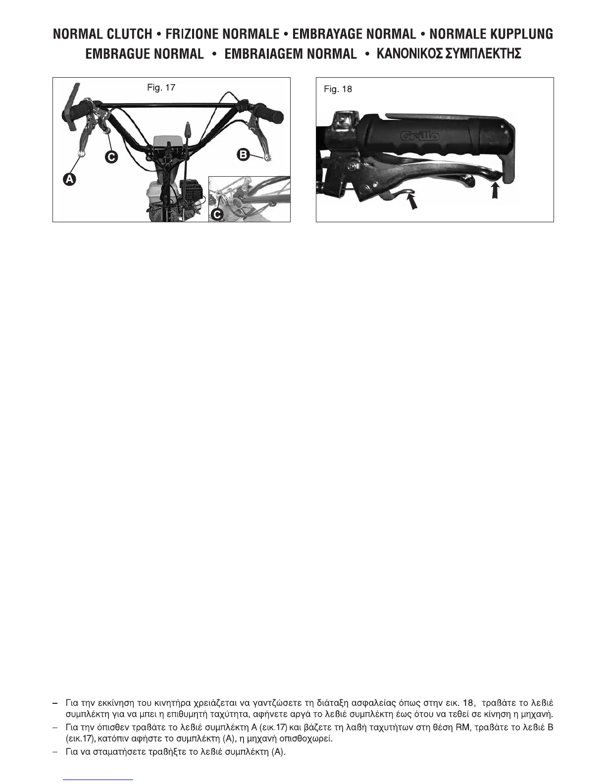 MA, puxe a alavanca B (fig. 17); largue, então, a embraiagem (A). A máquina recua.