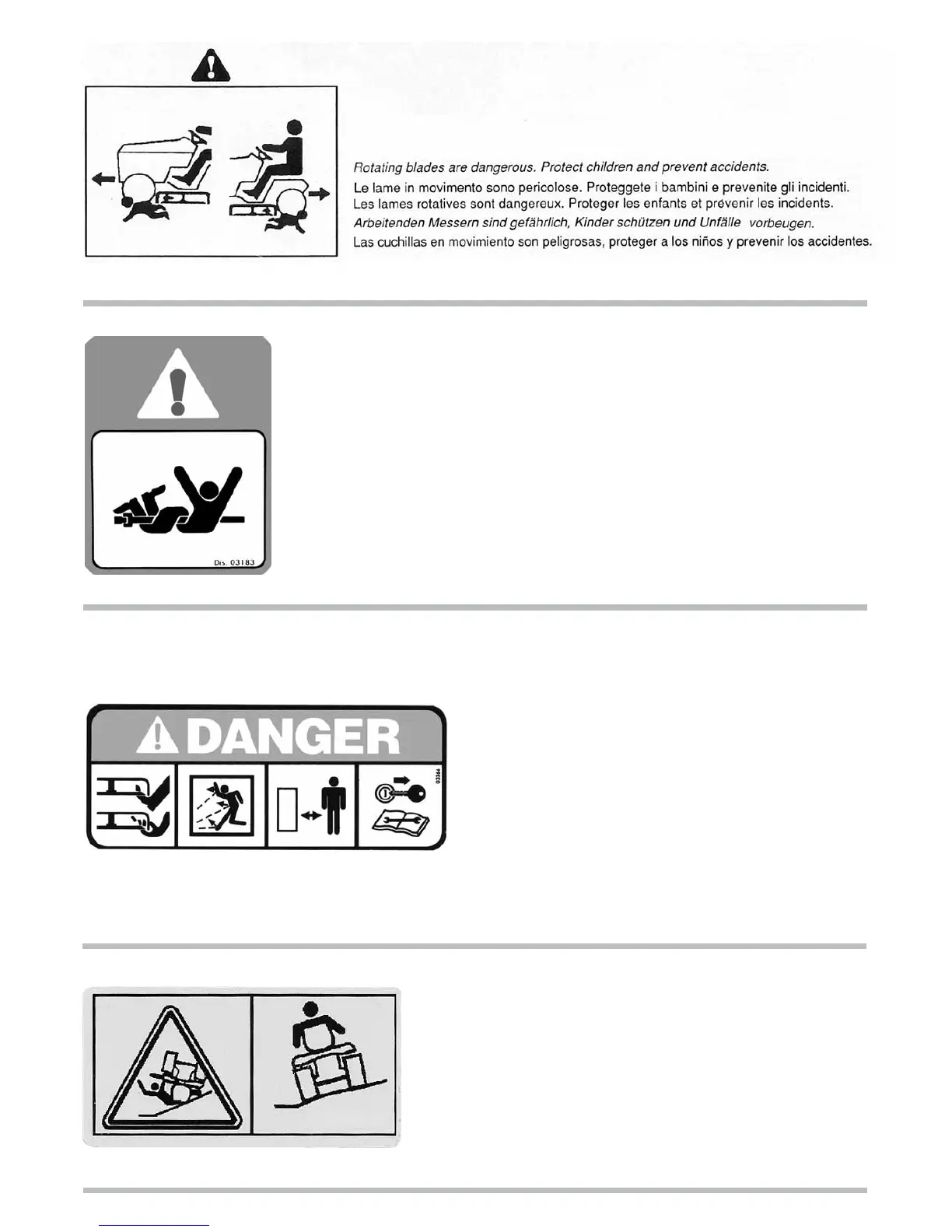 ACHTUNG! SCHARFE KLINGEN. Hände und Füsse fernhalten. Beim Mähen nicht über