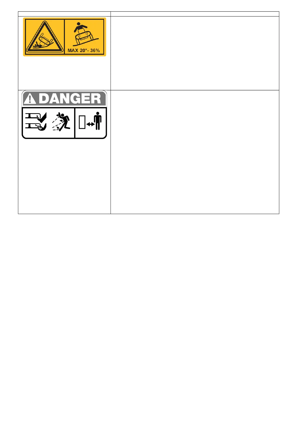 DANGER! Machine roll-over: Do not use this machine on slopes greater than 20° (36%).