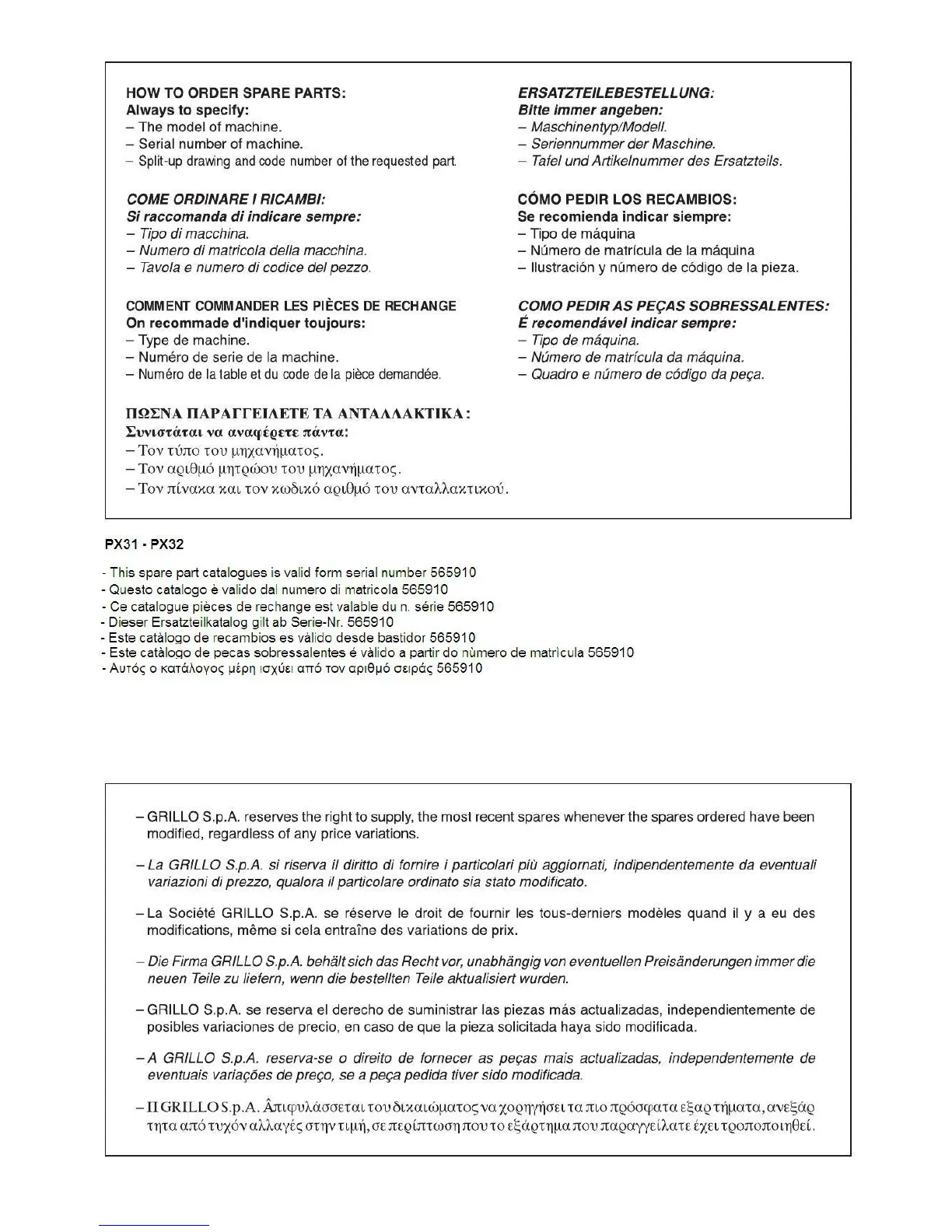 Grillo PX32 - EC Declaration of Conformity - Noise and Vibrations Levels; Certificado de Conformidad CE - Niveles de Ruido y Vibración; Certificado de Conformidade CE - Nível de Ruído - Vibração; Certificat de Conformité CE - Niveaux Sonores Et de Vibration