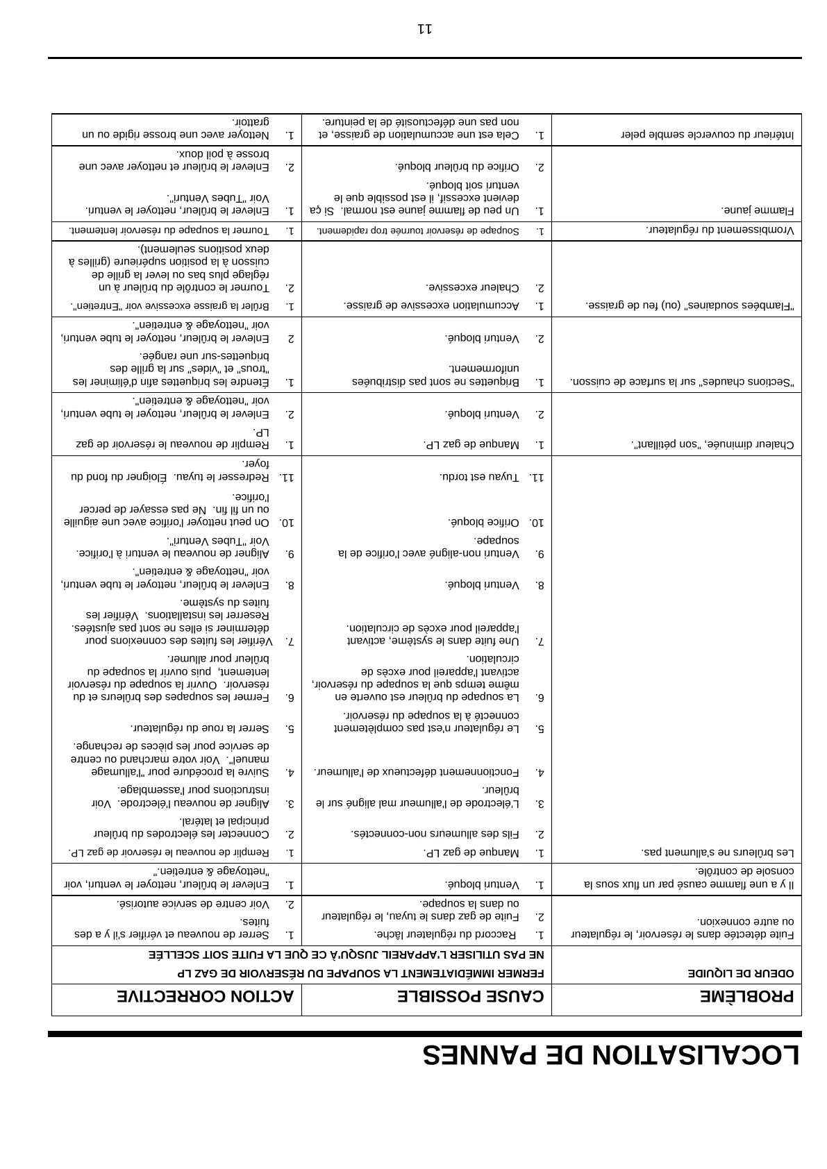 Chaleur diminuée, "son pétillant". 1. Manque de gaz LP. 1. Remplir de nouveau le réservoir de gaz